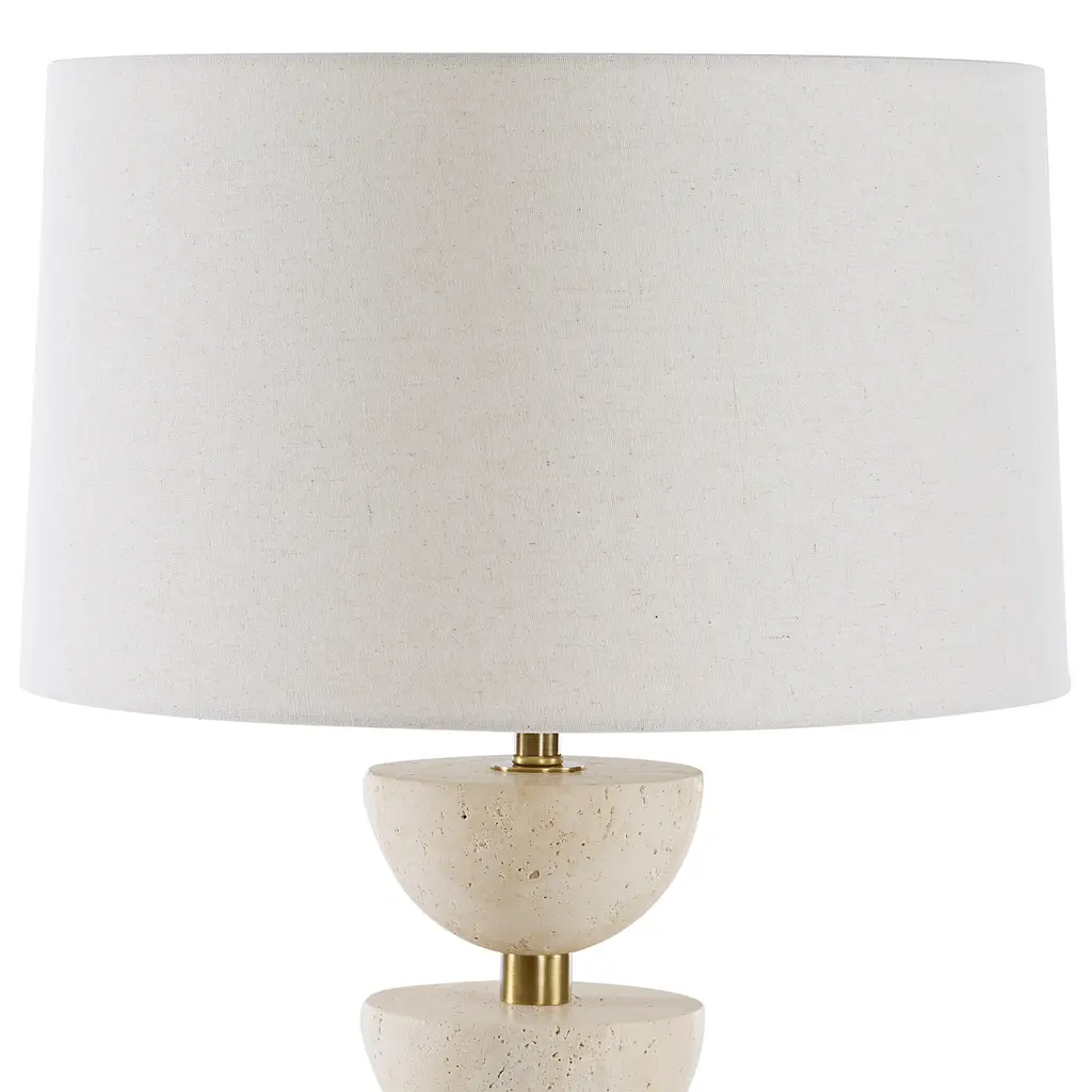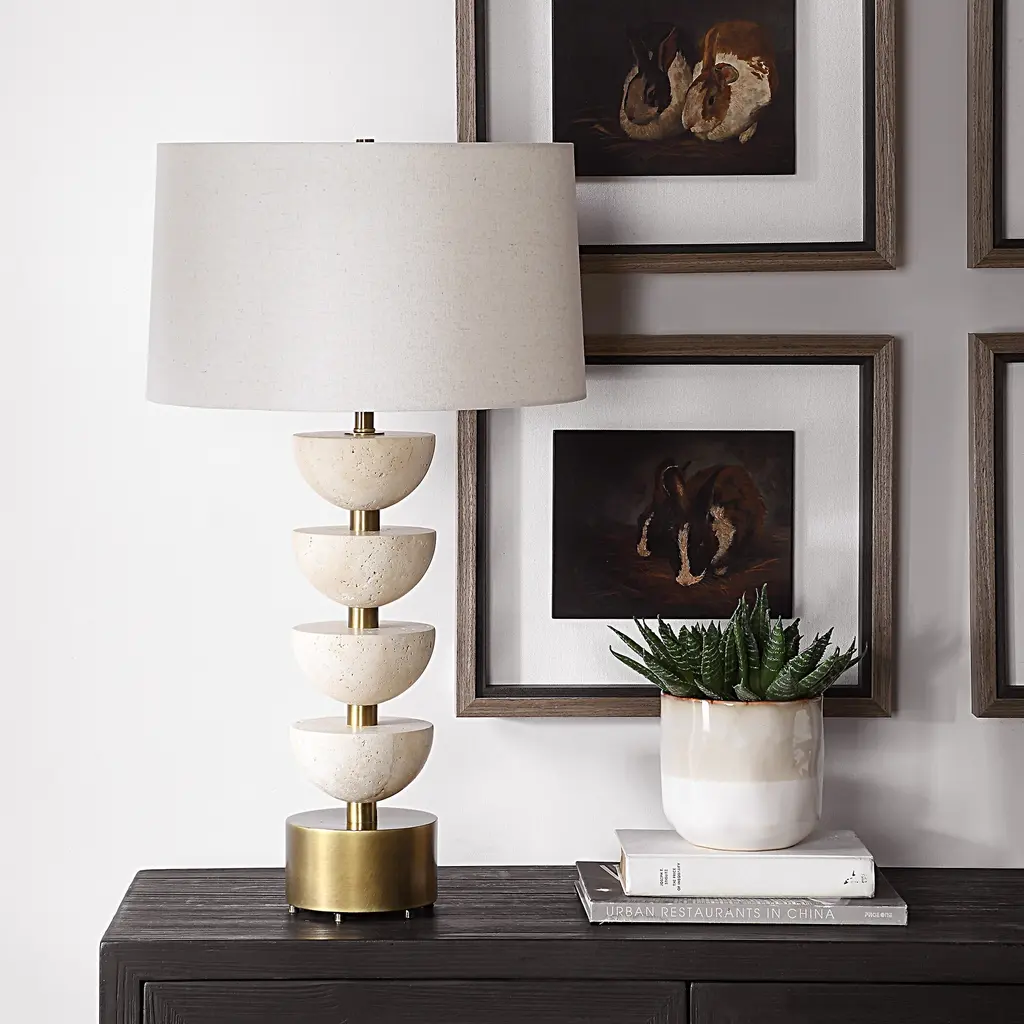 The Meridian Table Lamp Features Stacked Travertine Half-spheres On A Central Plated Brass Base With A Matching Foot. The Slightly Tapered Round Hardback Shade Is Finished In An Off-white Linen Fabric With Light Slubbing. Uttermost's Lamps Combine Premium Quality Materials With Unique High-style Design. With The Advanced Product Engineering And Packaging Reinforcement, Uttermost Maintains Some Of The Lowest Damage Rates In The Industry. Each Product Is Designed, Manufactured And Packaged With Shipping In Mind. Features: Include: One (1) Table Lamp Collection: Hemisphere Material: Travertine Stone, Metal, Fabric Made in China Dimentions: 17 W x 17 D x 30.5 H Item weight: 20 lbs This product will ship to you in one (1) box. Accessories pictured are NOT included. WARNING: This product can expose you to chemicals including nickel which is known to the State of California to cause cancer. For more information, go to www.p65warnings.ca.gov/furniture.