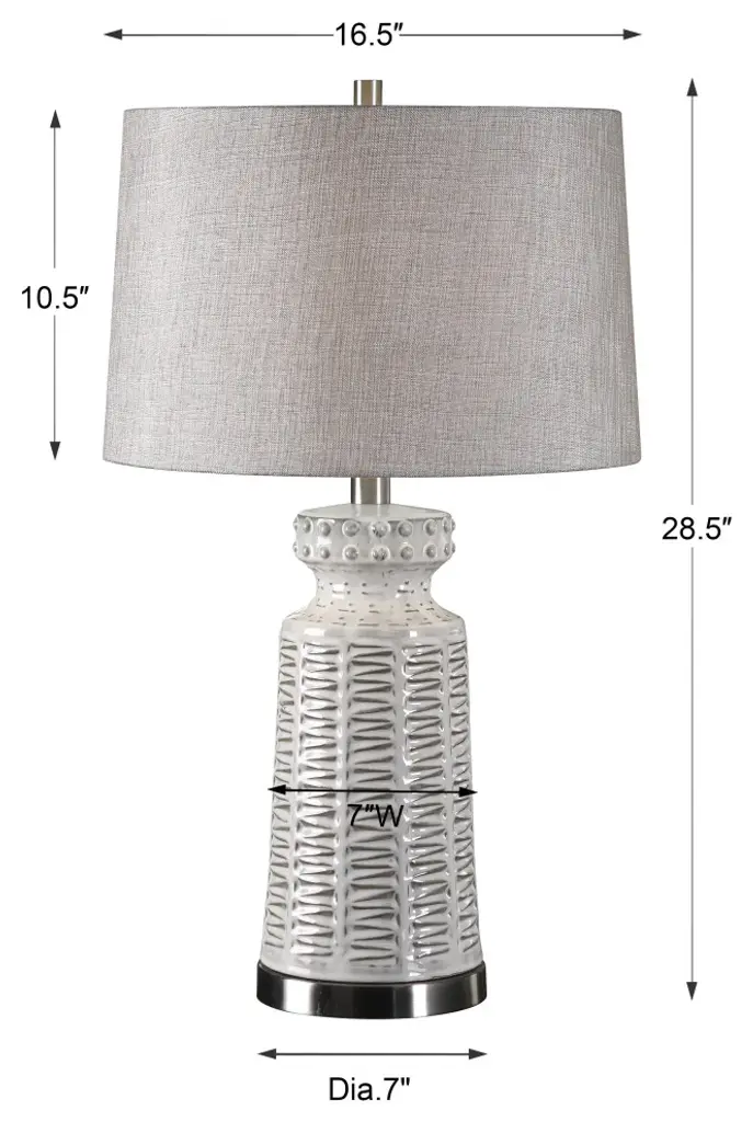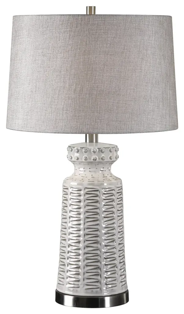 One Light Table Lamp from Kansa collection in Brushed Nickel finish. Number of Bulbs 1. Max Wattage 150.00 . No bulbs included. Embossed Ceramic, Featuring A Subtle Tribal Pattern, Finished In A Lightly Distressed Glossed White Glaze, Accented With Brushed Nickel Plated Details. The Slightly Tapered Round Hardback Shade Is A Light Gray Beige Linen Fabric. Due To The Nature Of Fired Glazes On Ceramic Lamps, Finishes Will Vary Slightly. No UL Availability at this time.