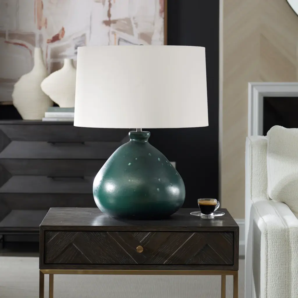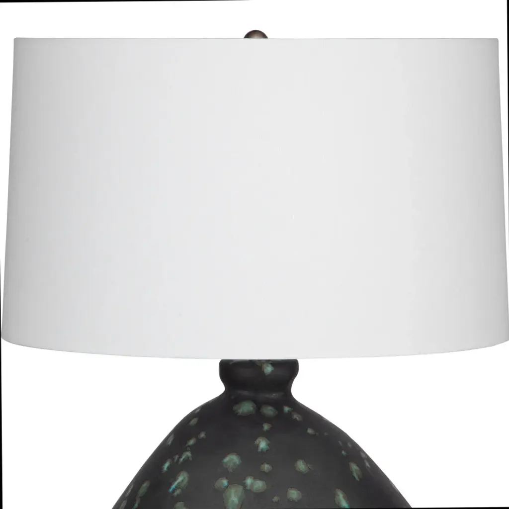 Featuring An Organic Shaped Ceramic Base, The Killarney Table Lamp Is Adorned With Shades Of Emerald Green Glazes, Seafoam Distressed Detailing And Subtle Cream Undertones, Paired With Antique Brass Plated Details. The Slightly Tapered Round Hardback Shade Is Made In A Casual White Linen Fabric.