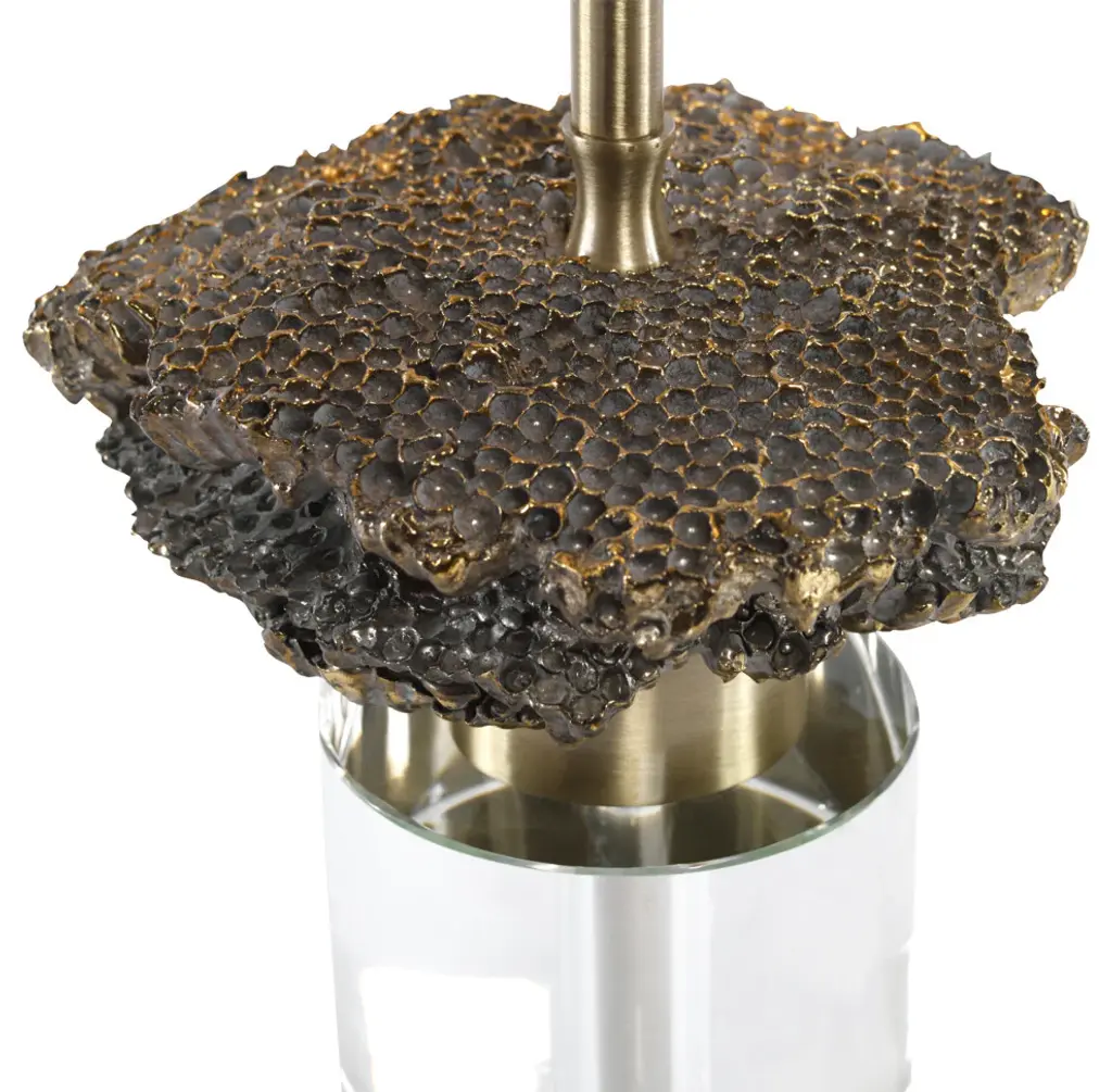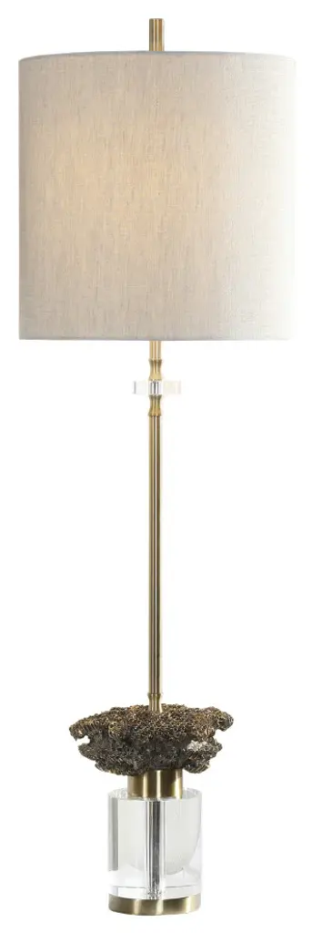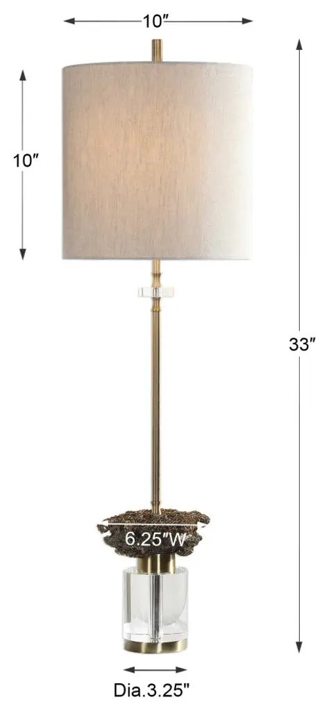 One Light Table Lamp from Kiota collection in Brushed Brass finish. Number of Bulbs 1. Max Wattage 150.00No bulbs included. This Very Unique Lamp Base Consists Of A Delicate, Resin-treated Casting Of A Barn Wasp`s Nest Finished In A Heavily Antiqued Metallic Gold, Set On A Solid Crystal Base, Accented With Brushed Brass Plated Details. The Round Hardback Drum Shade Is An Oatmeal Linen Fabric With Natural Slubbing. No UL Availability at this time.