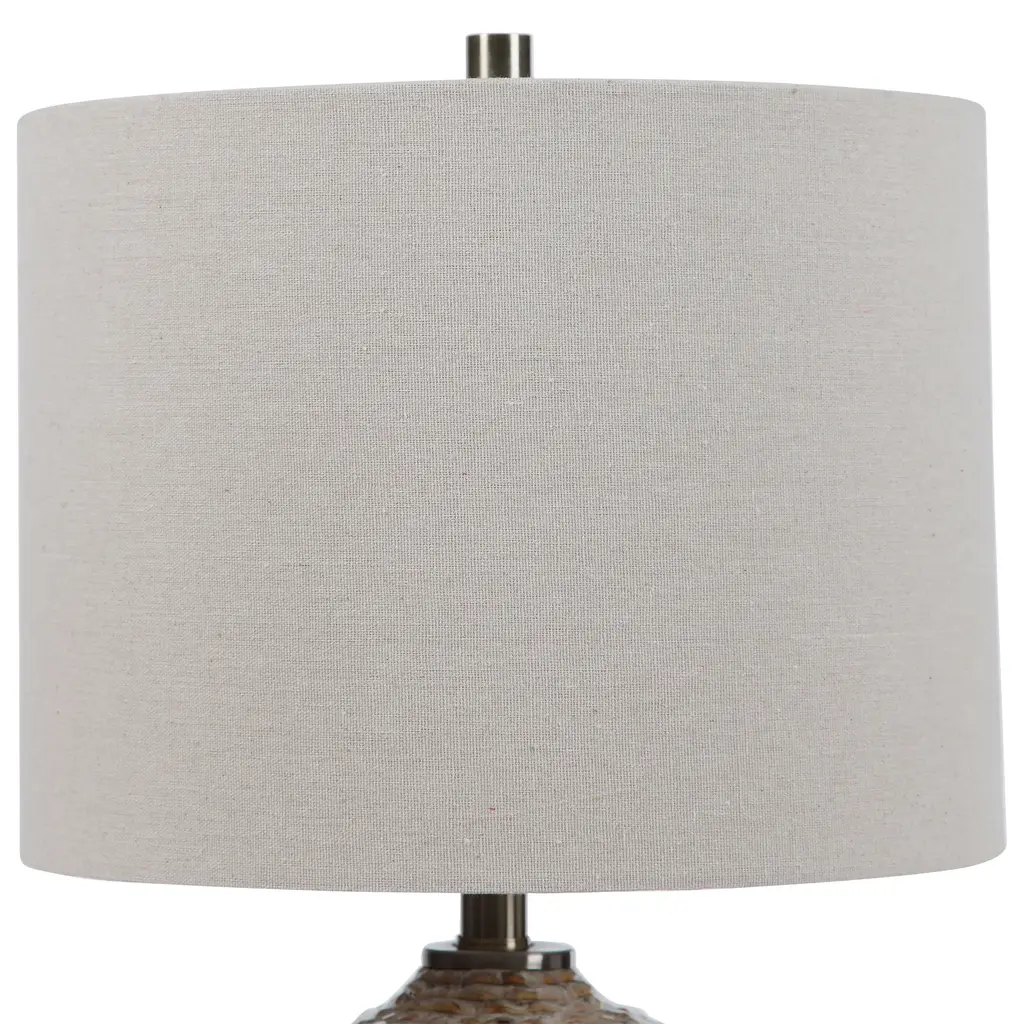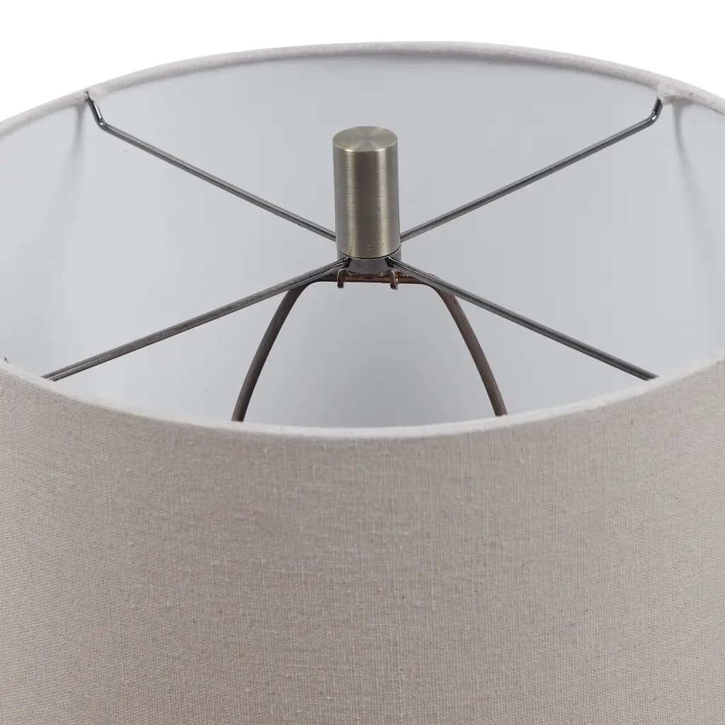 Uttermost's lamps combine premium quality materials with unique high-style design. With the advanced product engineering and packaging reinforcement, Uttermost maintains some of the lowest damage rates in the industry. Each product is designed, manufactured and packaged with shipping in mind. This unique ceramic table lamp displays a rustic, wavy ribbed texture in rust brown glaze covered in aged taupe tones, accented with light brushed brass details. The hardback drum shade is light beige linen with natural slubbing. Features: Set includes: One (1) table lamp Materials: 85% ceramic, 5% metal and 10% fabric Finish: Rusted brown glaze Shape color: Light beige Designer: David Frisch Voltage: 110V Wattage: 150W Bulb quantity: 1 Bulb type: Type A Socket type: 3-way Dimensions: Table lamp: 22 inches high x 14 inches wide x 14 inches deep Shade: (14x14) inches top x (14x14) inches bottom x 10.5 inches high This product will ship to you in one (1) box. Accessories pictured are NOT included. WARNING: This product can expose you to chemicals including cadmium which is known to the State of California to cause cancer or birth defects or other reproductive harm. For more information, go to www.P65Warnings.ca.gov/furniture.