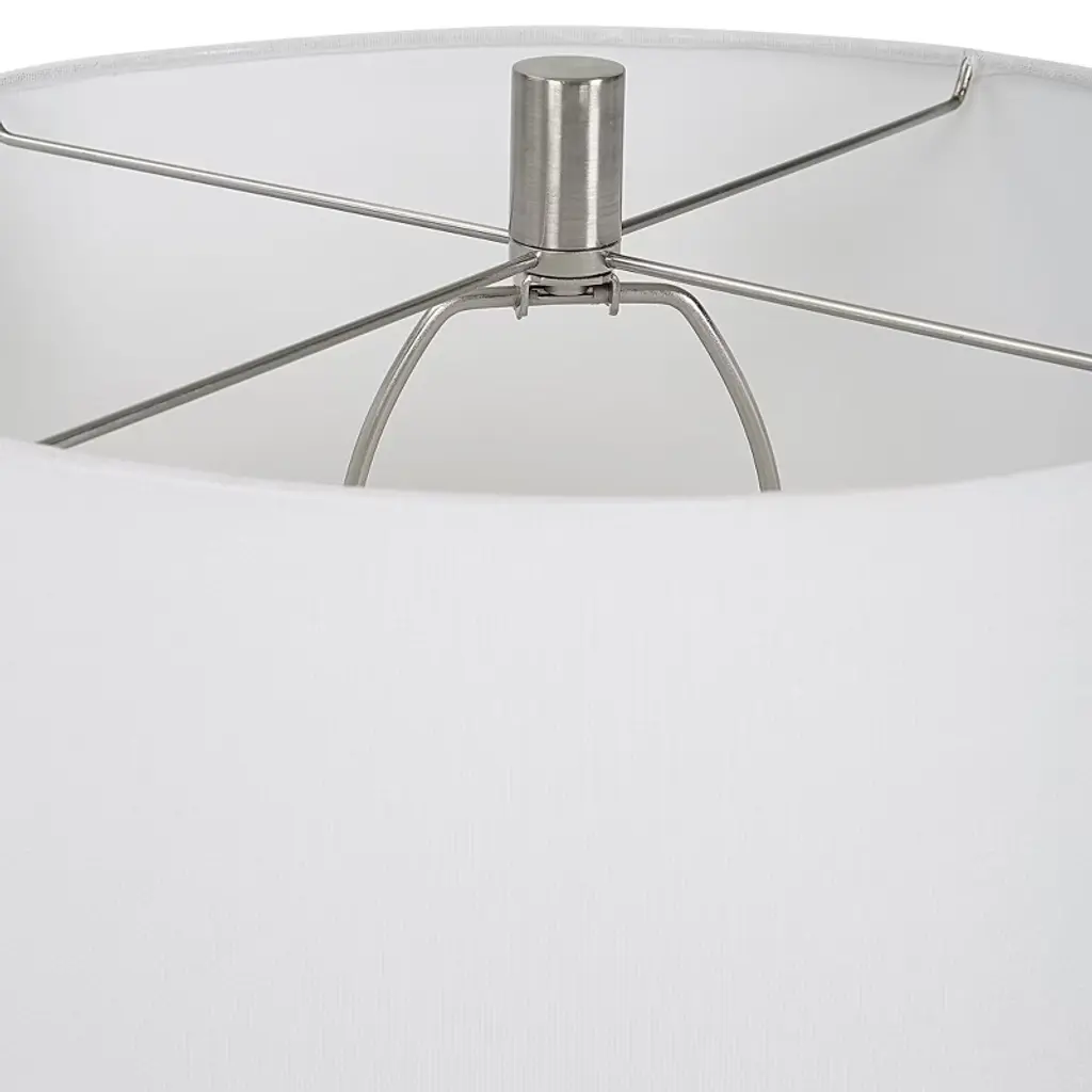 Modern minimalism meets subtle elegance in the Uttermost Levadia Table Lamp. Designed by David Frisch, this ceramic lamp features a smooth matte white glaze accented with soft brushed gray detailing. Brushed nickel-plated hardware and a thick crystal foot enhance its sophisticated silhouette. Measuring 15"D × 15"W × 31.5"H and weighing 7 lbs, it is topped with a round white hardback drum shade. A 3-way socket supports a single 150W Type A bulb, making this piece a functional and stylish accent for any living room, bedroom, or office. Key Benefits Subtle Modern Elegance: Matte white ceramic body with brushed gray detail and crystal base — 15"D × 15"W × 31.5"H Soft Ambient Lighting: Round drum shade diffuses light beautifully with a 3-way switch for brightness control Designer Appeal: Crafted by David Frisch, combining clean lines with premium materials Durable Construction: Engineered for safe delivery with reinforced packaging Versatile Style: Complements modern, transitional, and coastal spaces