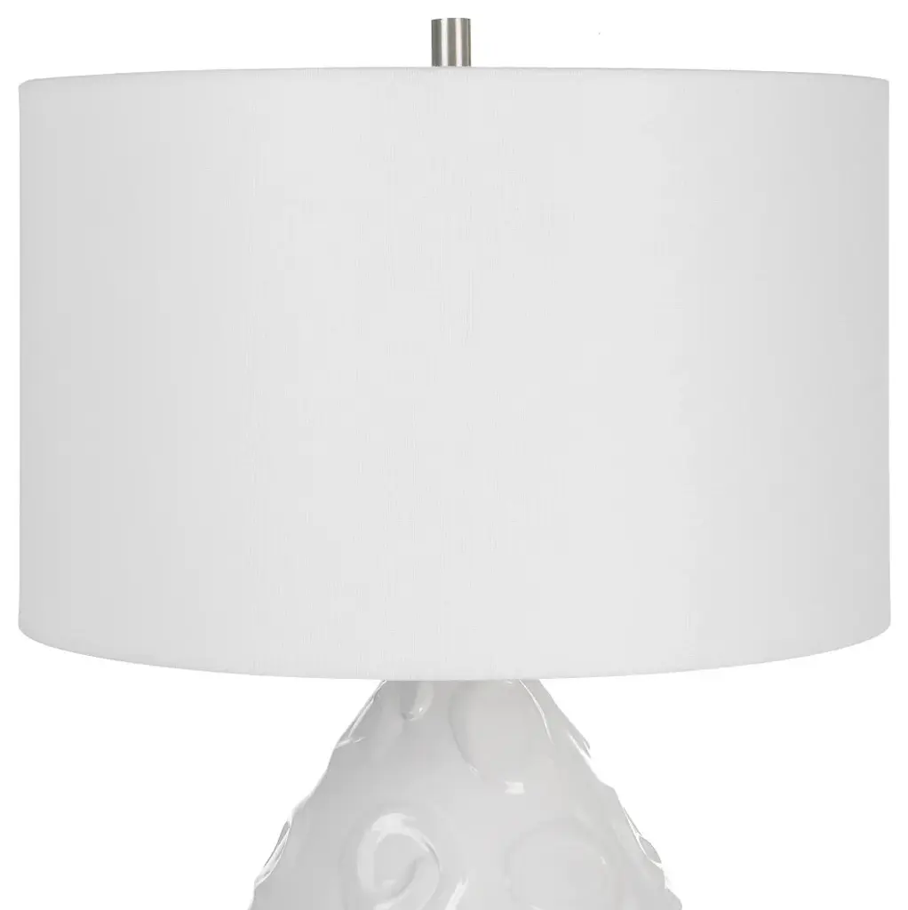Handcrafted From Ceramic, This Table Lamp Features A Clean White Glaze With Individually Applied Whimsical Loop Details, And Plated Brushed Nickel Accents. The Hardback Drum Shade Is Covered In A White Linen Fabric. Uttermost''s Lamps Combine Premium Quality Materials With Unique High-style Design. With The Advanced Product Engineering And Packaging Reinforcement, Uttermost Maintains Some Of The Lowest Damage Rates In The Industry. Each Product Is Designed, Manufactured And Packaged With Shipping In Mind. DimensionsDepth: 16 in. Width: 16 in. Height: 25 in.