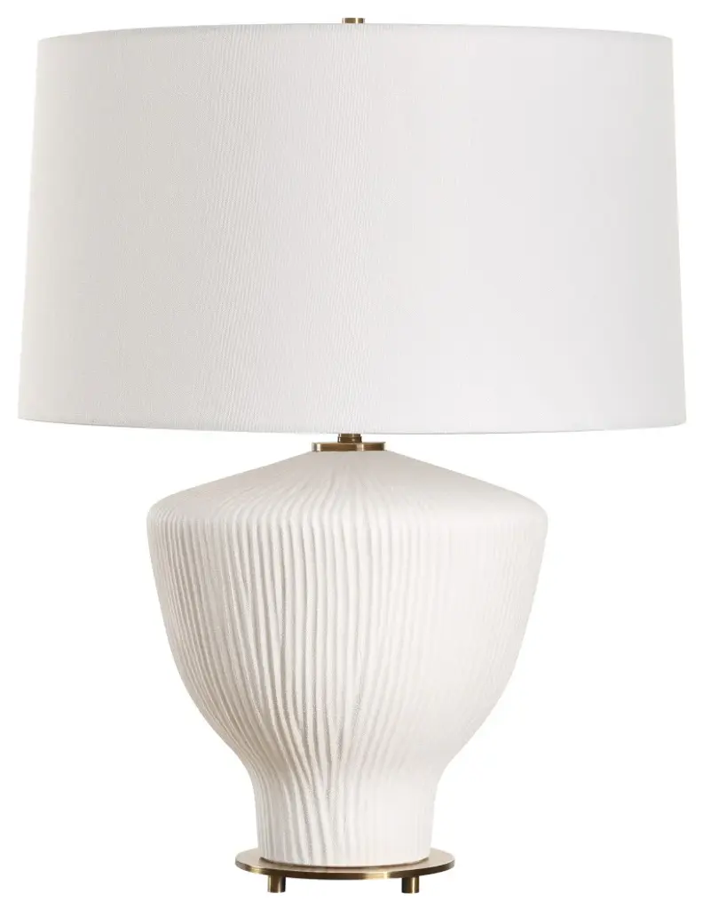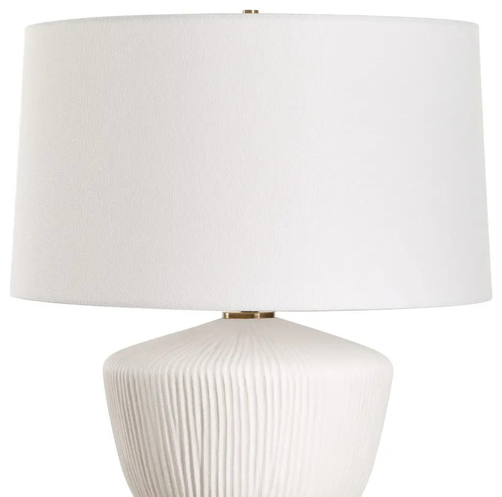 The Maisie Table Lamp Is A Classic Yet Timeless Piece That Features A Unique Ceramic Based With A Vertical Ribbed Texture Finished A Satin White Accented With Brass Plated Details. The Slightly Tapered Round Hardback Shade Is Covered In A White Linen Fabric.