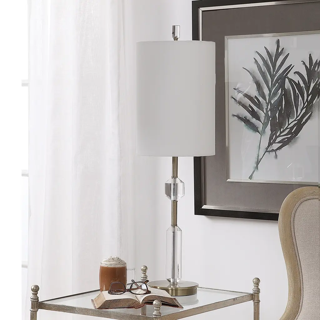 Uttermost's lamps combine premium quality materials with unique high-style design. With the advanced product engineering and packaging reinforcement, Uttermost maintains some of the lowest damage rates in the industry. Each product is designed, manufactured and packaged with shipping in mind. This elegant piece showcases a slender profile featuring polished cut crystal details, paired with plated antique brass accents. A round hardback drum shade in white linen fabric completes this sophisticated design. Features: Set includes: One (1) table lamp Materials: Steel, Crystal and Fabric Finish: Polished Cut Crystal and Plated Antique Brass Special Features: Designer: David Frisch Shade description: Round hardback drum Number of lights: 1 Wattage: 100 W Bulb quantity: 1 Bulb type: Type A Socket type: On-Off Voltage: 110 V Dimensions: Table lamp dimensions: 33.25 inches high x 10 inches wide x 10 inches deep Shade dimensions: (10x10) inches top x (10x10) inches bottom x 14 inches high This product will ship to you in one (1) box. Accessories pictured are NOT included. WARNING: This product can expose you to chemicals including nickel which is known to the State of California to cause cancer. For more information, go to www.P65Warnings.ca.gov/furniture.