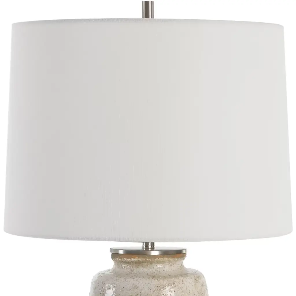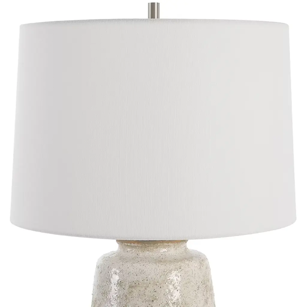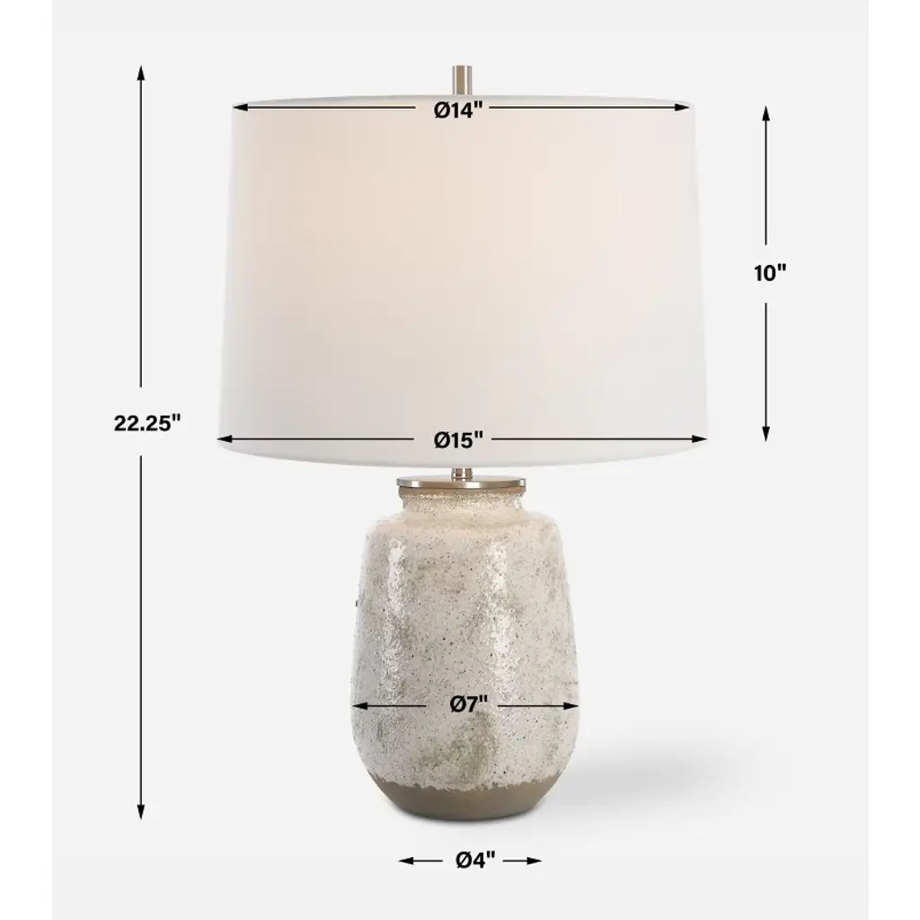 Elevate your space with the naturally refined beauty of the Medan Taupe and Gray Table Lamp. Crafted from ceramic with a porous texture, the base showcases a harmonious blend of taupe and dove gray glaze, revealing a raw natural finish at the bottom for added earthiness. Brushed nickel accents introduce a sleek, contemporary touch. Key Features: Porous ceramic base in taupe and dove gray glaze with raw natural bottom Brushed nickel accents lend subtle metallic sophistication Slightly tapered white linen drum shade enhances clean modern lines Ideal for refined rustic, coastal, or transitional interiors Dimensions: 22H, SHADE 10H x 15 Dia. (in), Weight: 9 lbs