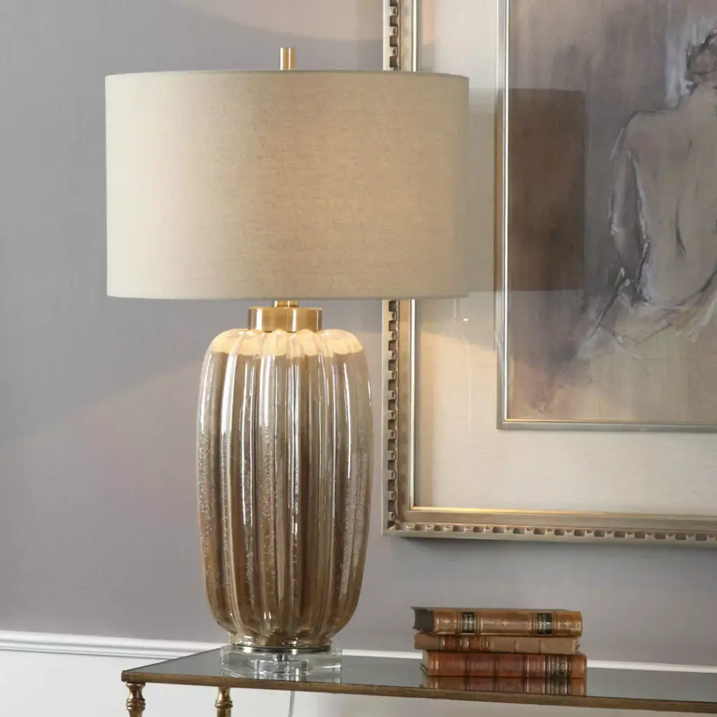 Offering the beloved appeal of retro accents, Uttermost crafted this texturized beauty to add function and style to a traditional living space. Its deeply grooved base is given a two-tone pearlescent ivory and rust brown finish, which looks sensational against a round crystal base. Bring a beloved style back to life with this ivory and rust brown ceramic table lamp.