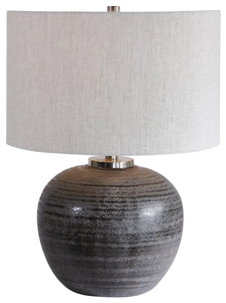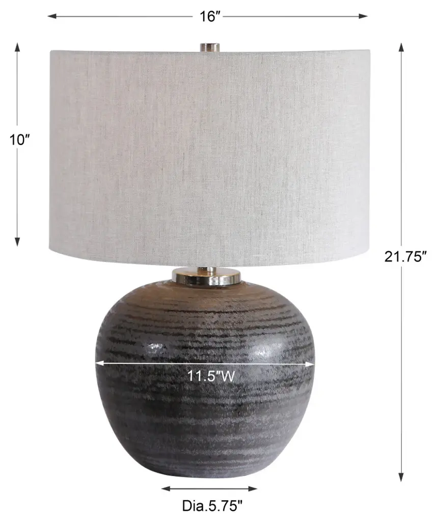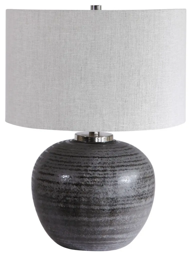 Finished in a charcoal glaze with etched texture, this table lamp adds a casual yet contemporary feel to a space. The round ceramic base is complimented by brushed nickel hardware. A round hardback drum shade in oatmeal linen completes the piece.Wattage: 150WBulb Type: TYPE ASocket Type: 3-WAYSwitch Type: SOCKET SWITCH