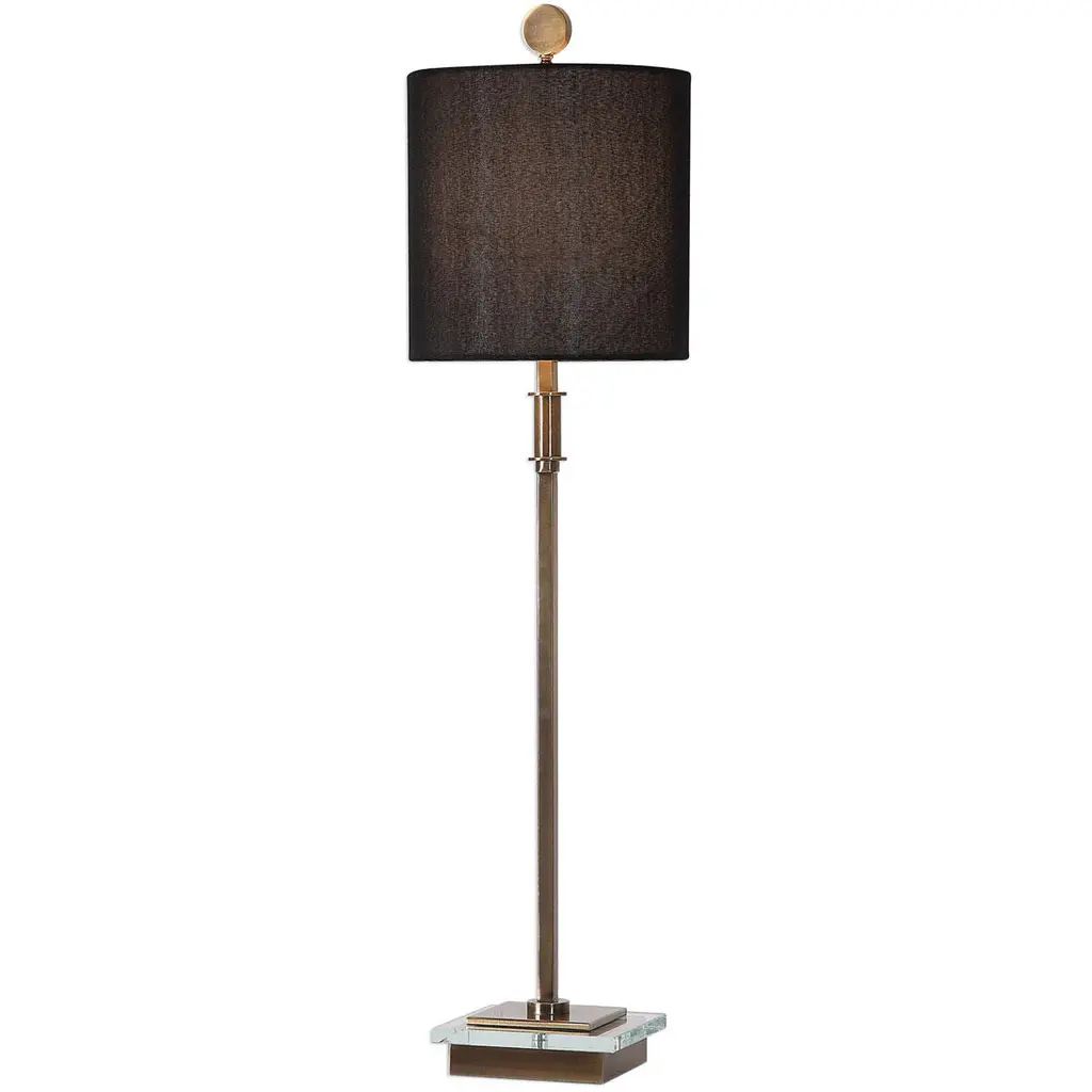 Place the Volante iron and crystal table lamp with a black shade in an industrial, modern or luxe setting for the perfect accent piece. From the Uttermost brand, the plated antique brass iron base contrasts with the thick crystal slab accent in an intriguing manner. A black linen hardback drum shade adds to the suspense and offers a delicate touch to the design.