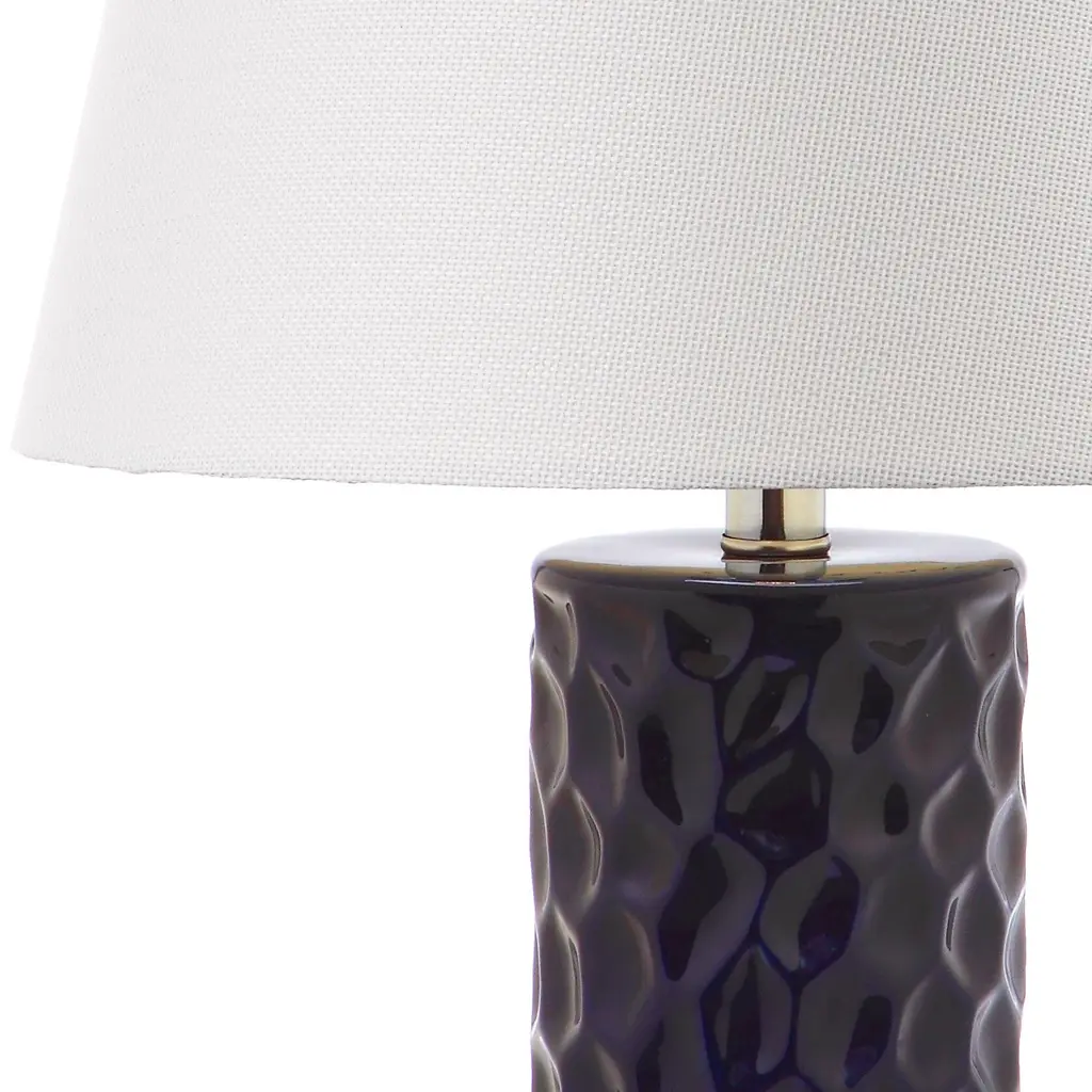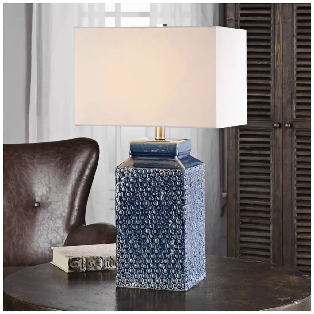 This bold sapphire blue table lamp has a stylized, square jug base with a heavily textured finish. Made from ceramic and iron, it features brushed nickel plated details and a square crystal finial. Topped off by a white linen, square hardback shade. Please note: finishes of fired ceramic glazes will vary slightly from piece to piece. From Uttermost.