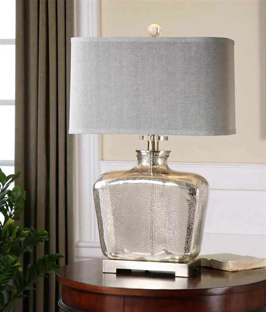 Speckled Mercury Glass With Brushed Nickel Plated Details And Crystal Accents. The Slightly Tapered Rectangle Hardback Shade Is A Light Beige Linen Fabric With Natural Slubbing And Rounded Corners. Uttermost''s Lamps Combine Premium Quality Materials With Unique High-style Design. With The Advanced Product Engineering And Packaging Reinforcement, Uttermost Maintains Some Of The Lowest Damage Rates In The Industry. Each Product Is Designed, Manufactured And Packaged With Shipping In Mind. DimensionsDepth: 10 in. Width: 18 in. Height: 28 in.