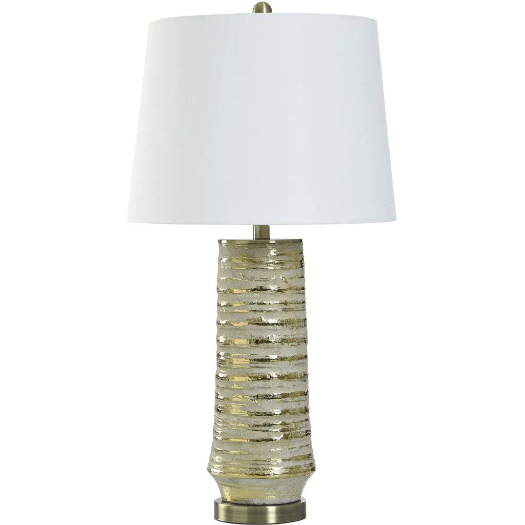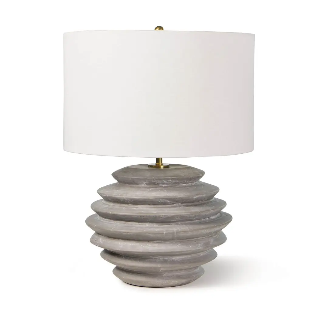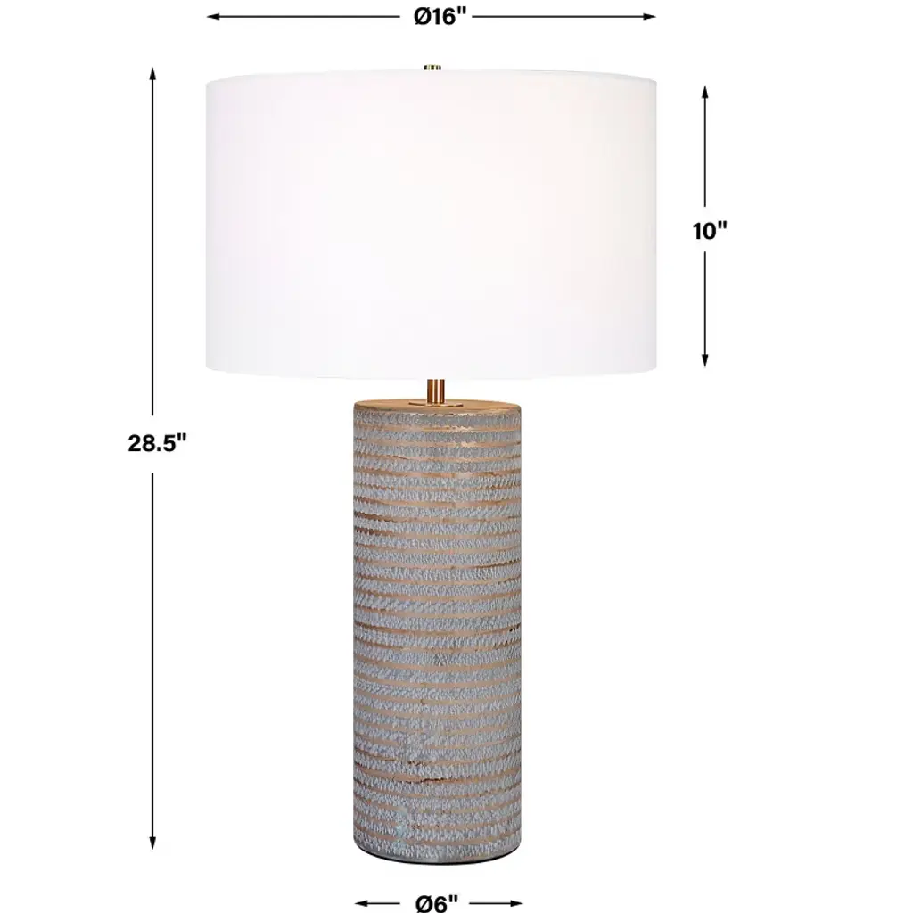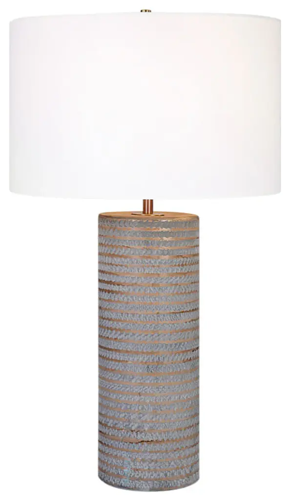 Elevate your space with the organic sophistication of the Uttermost Monolith Gray Table Lamp. Expertly crafted from ceramic, this sculptural lamp showcases a rustic chiseled texture with frosted pewter gray undertones and carved sepia accents. Measuring 16"D × 16"W × 28.5"H, it’s complemented by antique brass-finished iron hardware and topped with a white round drum hardback fabric shade. Designed by John Kowalski, this lamp brings texture, warmth, and modern craftsmanship into bedrooms, living rooms, and reading corners. With a 3-way socket and support for up to 150W (Type A bulb), it offers ambient or task lighting with designer appeal. Key Benefits Textural Beauty: Chiseled ceramic form with layered gray and sepia accents creates tactile and visual interest – 28.5"H Elegant Contrast: Paired with antique brass hardware and white drum shade for a modern yet warm aesthetic Functional Versatility: 3-way socket offers adjustable lighting – ideal for ambient, task, or reading light Designer Statement: A refined piece from the Monolith Collection by John Kowalski Perfectly Sized: Balanced proportions at 16"W x 28.5"H suit nightstands, side tables, or entry consoles