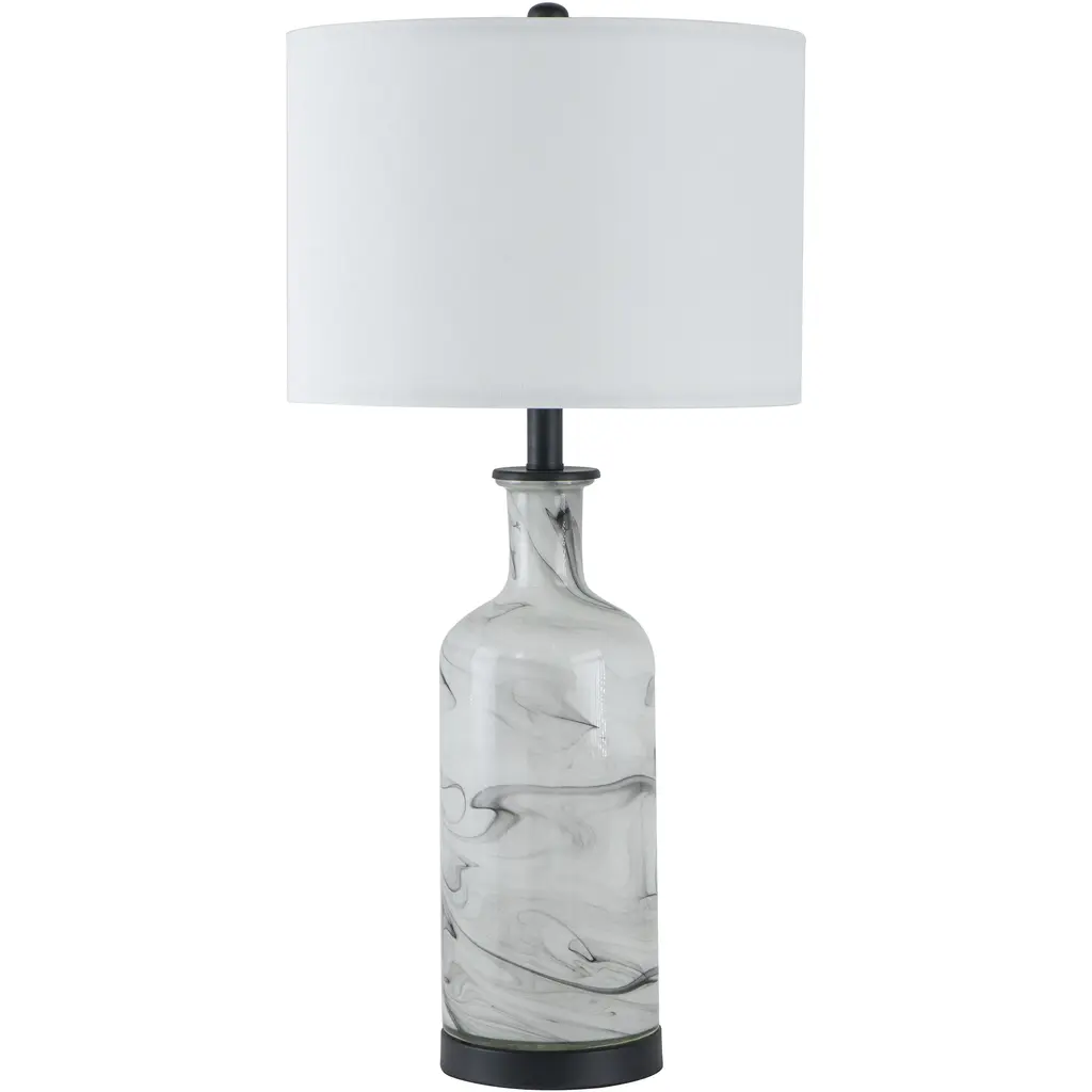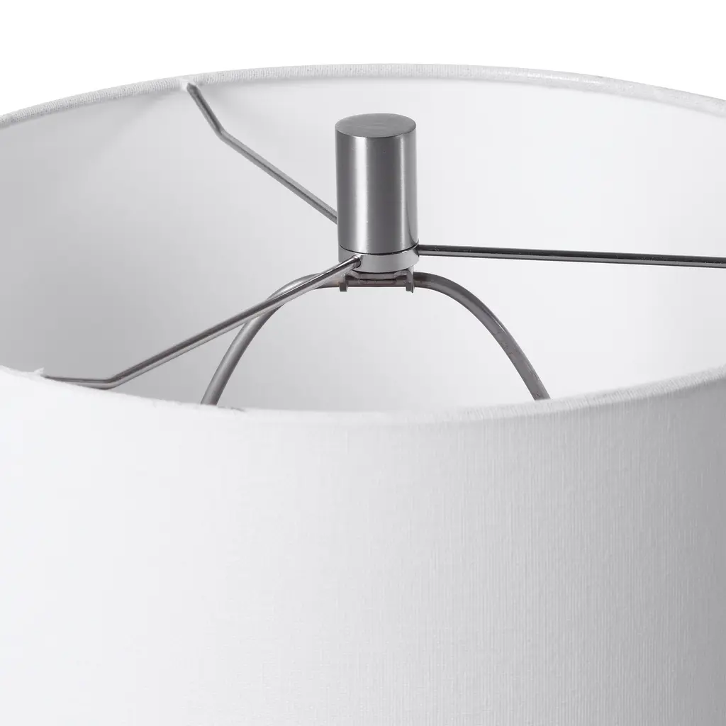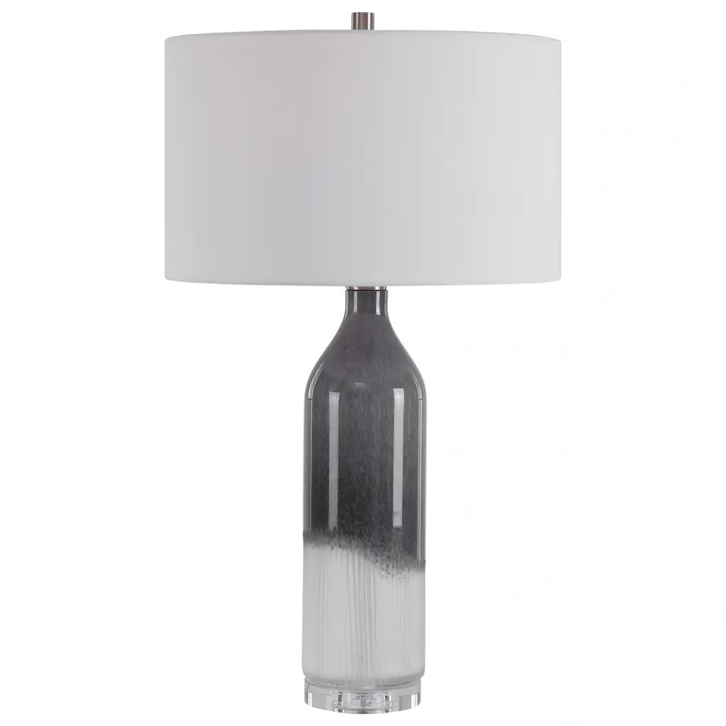 Uttermost's lamps combine premium quality materials with unique high-style design. With the advanced product engineering and packaging reinforcement, Uttermost maintains some of the lowest damage rates in the industry. Each product is designed, manufactured and packaged with shipping in mind. Perfect for any room style, this art glass table lamp features a transitional style with an light grey and frosted white ombre look, displayed on a thick crystal foot accented with brushed nickel details. The lamp is paired with a white fabric drum shade. Features: Set includes: One (1) table lamp Materials: 36% steel, 18% K9 crystal, 45% glass, 1% fabric Finish: Light grey, frosted white ombre Shade color: White Designer: David Frisch Voltage: 110V Wattage: 150W Bulb quantity: 1 Bulb type: Type A Socket type: 3-way Dimensions: Table lamp: 30.25 inches high x 17 inches wide x 17 inches deep Shade: (17x17) inches top x (17x17) inches bottom x 10 inches high This product will ship to you in one (1) box. WARNING: This product can expose you to chemicals including nickel which is known to the State of California to cause cancer. For more information, go to www.P65Warnings.ca.gov/furniture.