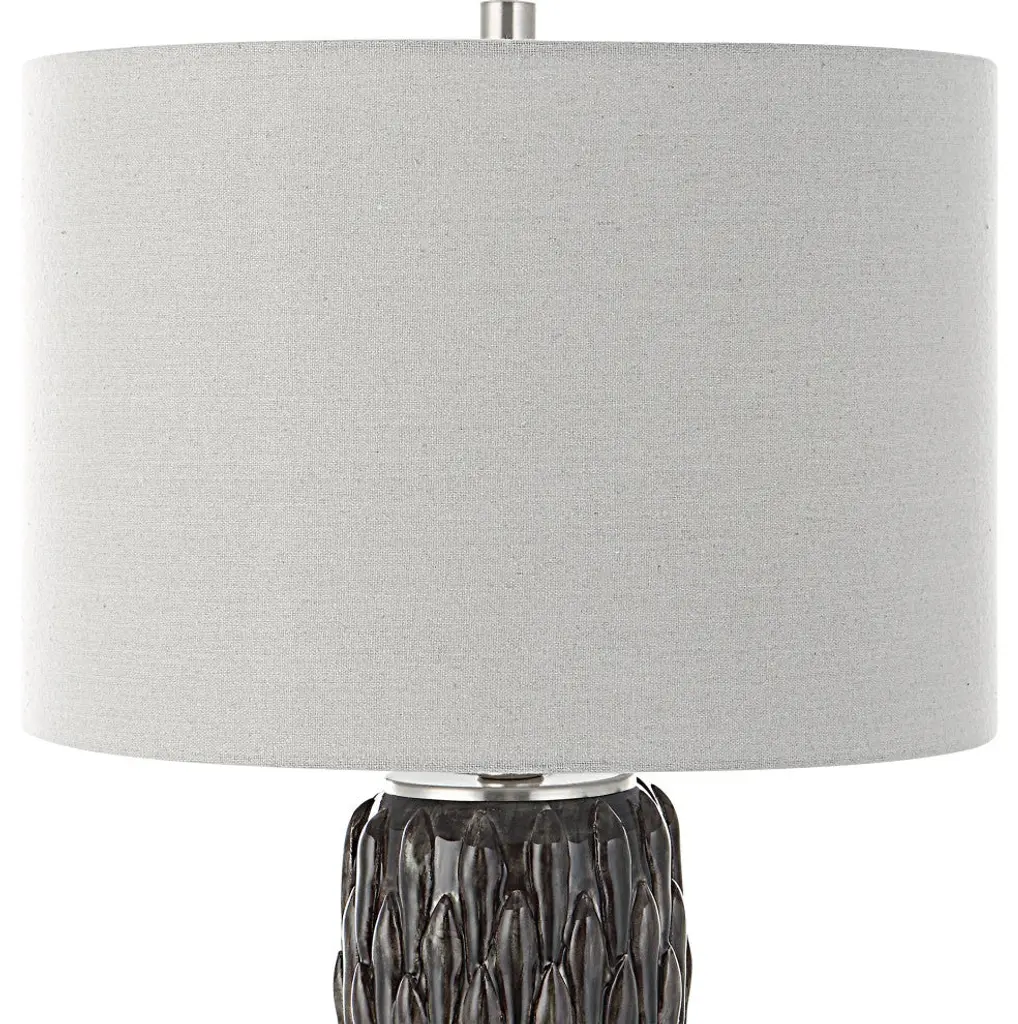 This Ceramic Table Lamp Features A Deep Mushroom Gray Glaze Over Carved Details, Accented With Polished Nickel Plated Details And An Elegant Crystal Foot. The Lamp Is Paired With A Hardback Drum Shade In Light Gray. Uttermost''s Lamps Combine Premium Quality Materials With Unique High-style Design. With The Advanced Product Engineering And Packaging Reinforcement, Uttermost Maintains Some Of The Lowest Damage Rates In The Industry. Each Product Is Designed, Manufactured And Packaged With Shipping In Mind. DimensionsDepth: 15. 5 in. Width: 15. 5 in. Height: 26. 5 in.
