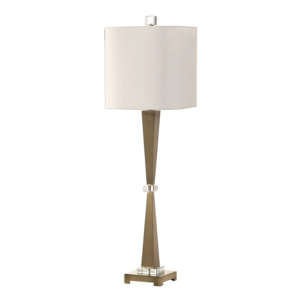 Uttermost's lamps combine premium quality materials with unique high-style design. With the advanced product engineering and packaging reinforcement, Uttermost maintains some of the lowest damage rates in the industry. Each product is designed, manufactured and packaged with shipping in mind. This sleek design features tapered steel columns, finished in plated, lightly antiqued brushed nickel, accented with thick crystal details. The square hardback shade is a white linen fabric with rolled edges. Features: Set includes: One (1) table lamp Materials: Steel, Linen Fabric and Crystal Finish: Antiqued Brushed Nickel, Clear and White Special Features: Designer: Jim Parsons Voltage: 110 Number of lights: 1 Shade description: Square hardback with rolled edges Wattage: 150W Bulb quantity: 1 Bulb type: Type A Socket type: 3-way Dimensions: Table lamp dimensions: 36.5 inches high x 11 inches wide x 11 inches deep Shade dimensions: 11 inches top diameter x 11 inches bottom diameter x 11 inches high This product will ship to you in one (1) box. Accessories pictured are NOT included.