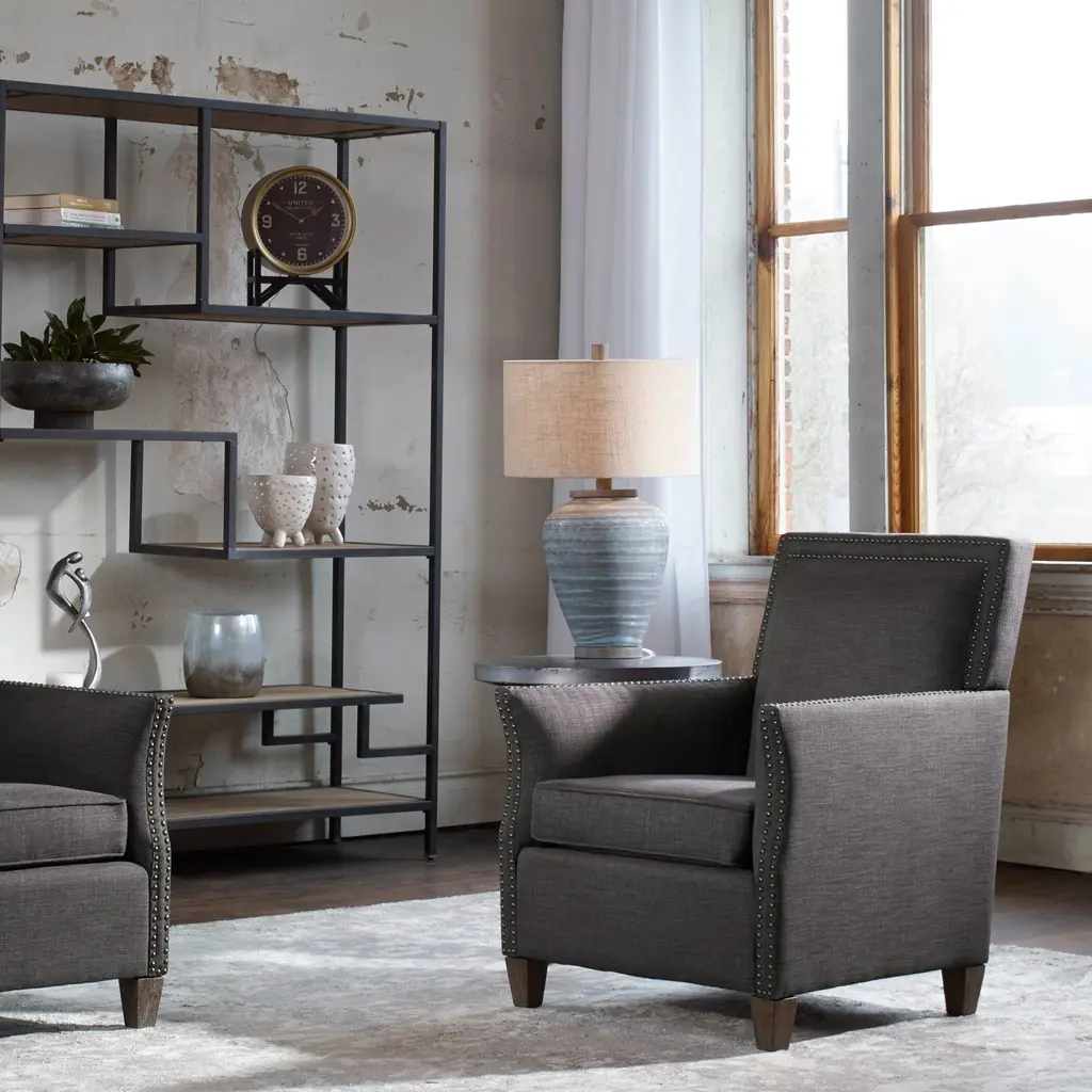 Uttermost's lamps combine premium quality materials with unique high-style design. With the advanced product engineering and packaging reinforcement, Uttermost maintains some of the lowest damage rates in the industry. Each product is designed, manufactured and packaged with shipping in mind. This table lamp design features a ceramic base with a global, bohemian flair, finished in a light aqua blue crackle glaze with a light grey textured pattern. The foot and neck have a porous texture, finished in a warm concrete look. A hardback drum shade in beige linen fabric with natural slubbing completes this piece. Features: Set includes: One (1) table lamp Materials: 70% ceramic, 20% resin, 10% fabric Finish: Aqua blue, grey Shade color: Beige Designer: John Kowalski Voltage: 110V Wattage: 150W Bulb quantity: 1 Bulb type: Type A Socket type: 3-way Dimensions: Table lamp: 27.5 inches high x 17 inches wide x 17 inches deep Shade: (17x17) inches top x (17x17) inches bottom x 10 inches high This product will ship to you in one (1) box. Accessories pictured are NOT included. WARNING: This product can expose you to chemicals including lead which is known to the State of California to cause cancer or birth defects or other reproductive harm. For more information, go to www.P65Warnings.ca.gov/furniture.