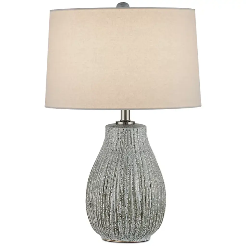 Modern sophistication meets artisanal texture in the Uttermost Pikes Stone-Ivory Table Lamp. Standing at 26 inches tall, this elegant ceramic lamp features a fluted silhouette with a porous, stone-like texture finished in a soft stone-ivory and taupe glaze. A thick crystal collar at the base adds a touch of luxury, while brushed nickel-plated steel accents lend a modern metallic edge. Topped with a light gray round drum hardback shade (17 inches wide, 10 inches high), this lamp delivers a balanced and inviting glow. Designed for 3-way lighting with one 150W Type A bulb, it’s ideal for adding timeless charm to living rooms, bedrooms, or offices. Key Features: Material: Ceramic body, brushed nickel-plated steel, clear crystal accent, and fabric shade Color: Stone-ivory and taupe ceramic glaze with light gray shade and crystal collar Frame & Finish: Fluted ceramic with porous texture and brushed nickel detailing Dimensions: Overall – 26" H x 17" W x 17" D | Shade – 10" H, 17" W Top/Bottom Style Match: Perfect for transitional, coastal, contemporary, or modern rustic interiors Shade: Round drum hardback shade in light gray linen fabric Socket & Bulb: 3-way socket compatible with 1 × 150W max Type A bulb (not included) Voltage: Operates on standard 110V power