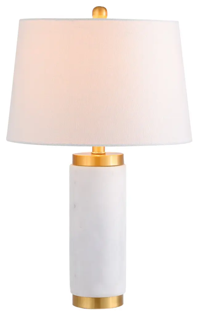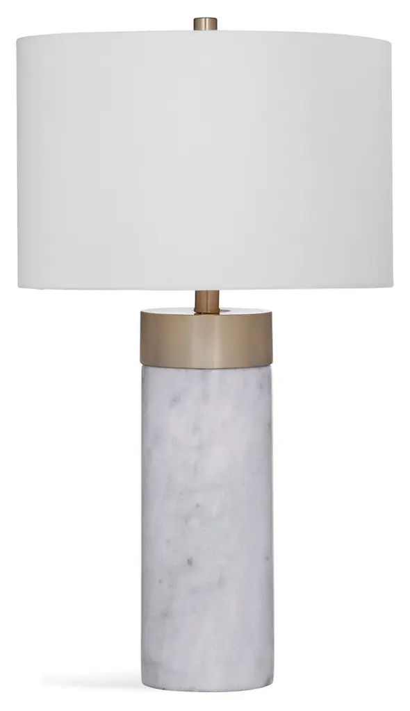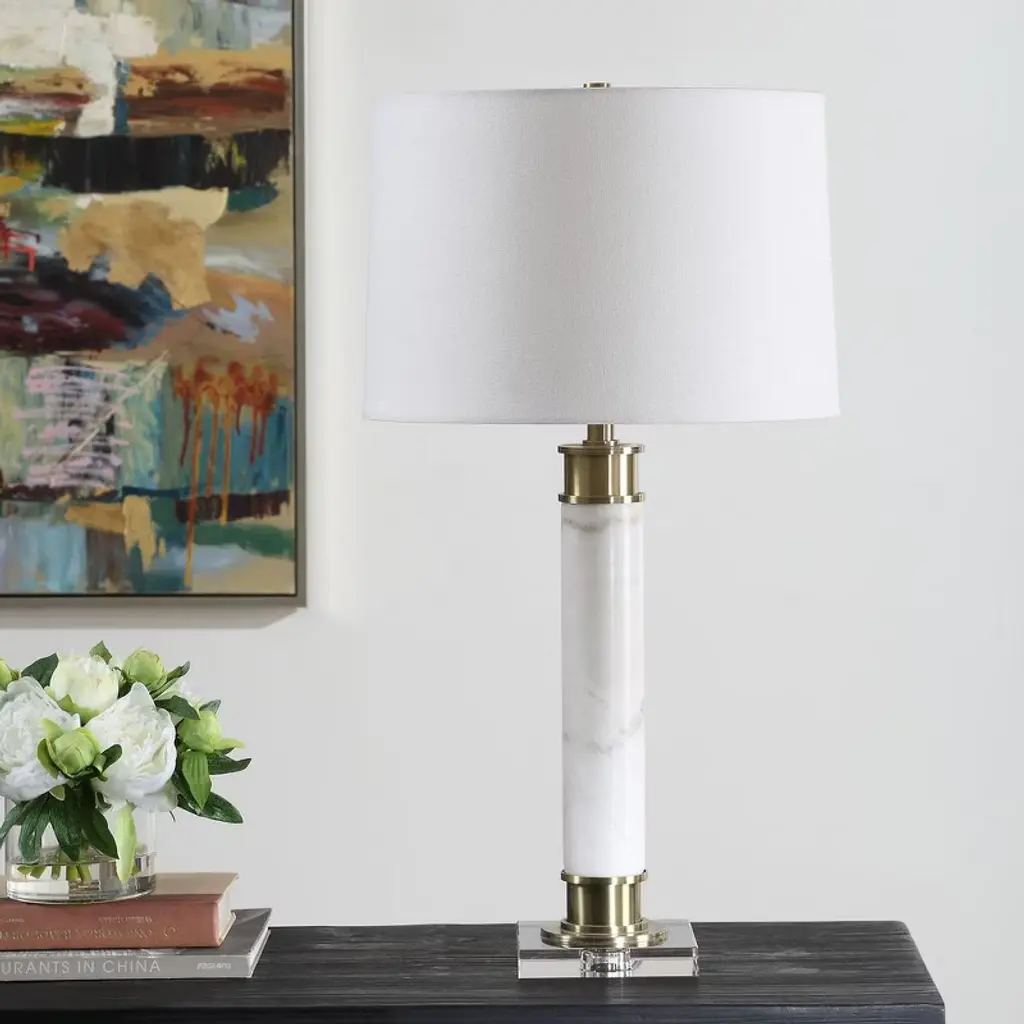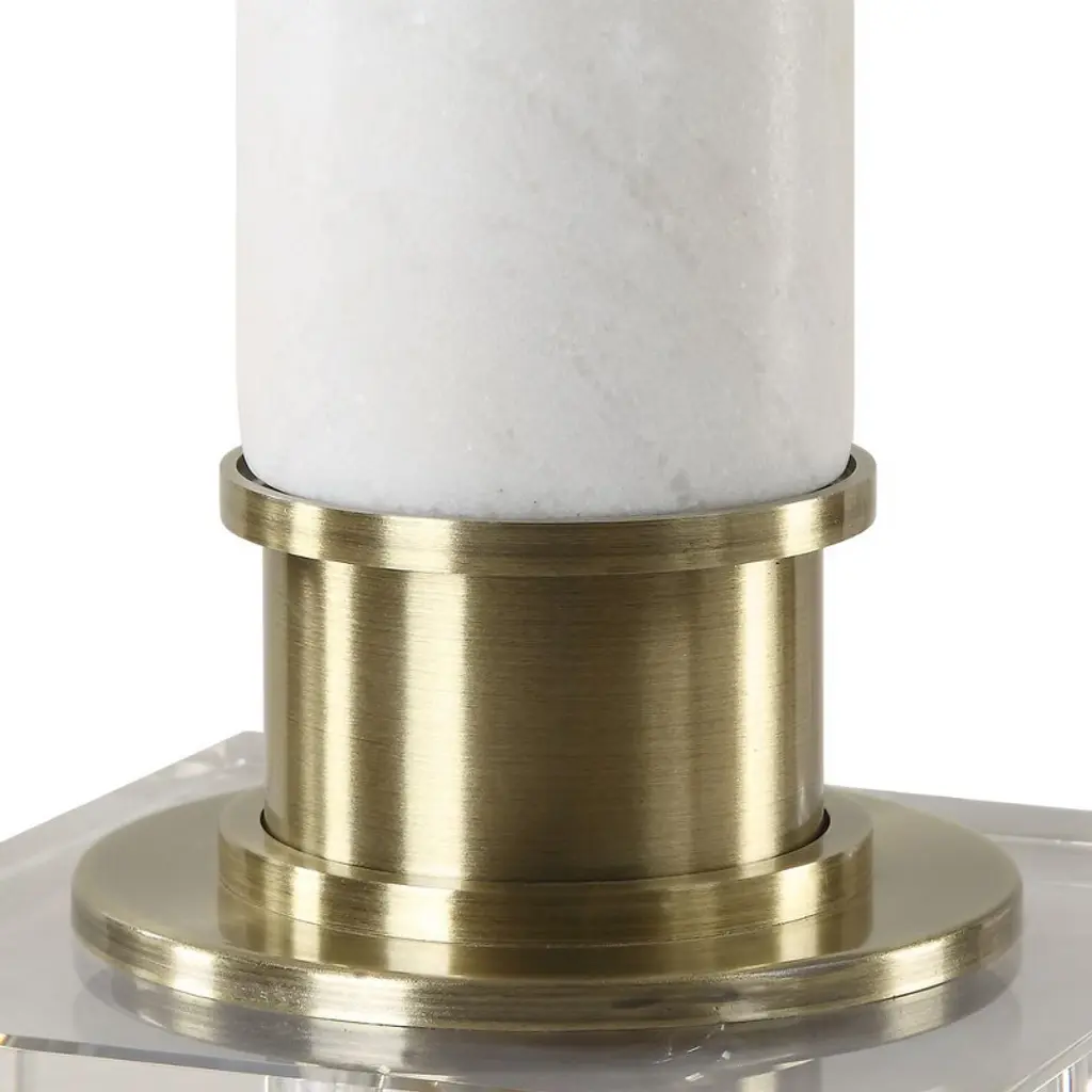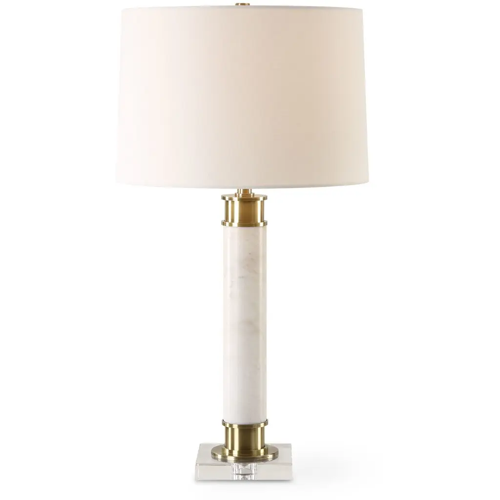 The Plinth White Marble Table Lamp is a harmonious blend of natural elegance and refined structure. Crafted from luxurious white marble with soft, organic veining, it rests atop a thick crystal foot that provides both stability and brilliance. Plated antique brass accents subtly frame the base, adding a warm contrast to the cool marble. Key Features: Solid white marble body with natural veining for visual depth Thick crystal foot base enhances elegance and stability Antique brass hardware offers warm, metallic contrast White linen tapered drum shade diffuses soft ambient light Dimensions (in): 28H, Shade: 10H x 15 Dia., Weight: 16 lbs