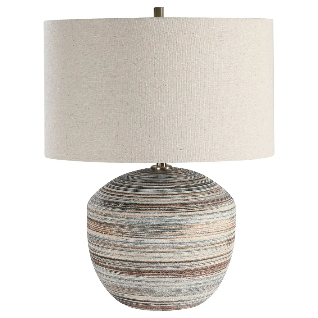 Uttermost's lamps combine premium quality materials with unique high-style design. With the advanced product engineering and packaging reinforcement, Uttermost maintains some of the lowest damage rates in the industry. Each product is designed, manufactured and packaged with shipping in mind. This ceramic accent lamp features a striped motif in neutral shades of brown, taupe, cream, and blue accented by light brushed brass plated details. A light beige linen drum shade with natural slubbing completes the piece. Features: Set includes: One (1) accent lamp Materials: Ceramic, iron Finish: Light brushed brass, neutral Shade color: Light beige linen Designer: Osvaldo Mendoza Bulb quantity: 1 Voltage: 110V Wattage: 150W Bulb type: Type A Socket type: 3-way Shade: Round drum hardback Dimensions: Accent lamp: 22 inches high x 17 inches wide x 17 inches deep Shade: (17x17) inches top x (17x17) inches bottom x 10 inches high This product will ship to you in one (1) box. WARNING: This product can expose you to chemicals including titanium dioxide which is known to the State of California to cause cancer. For more information, go to www.P65Warnings.ca.gov/furniture.