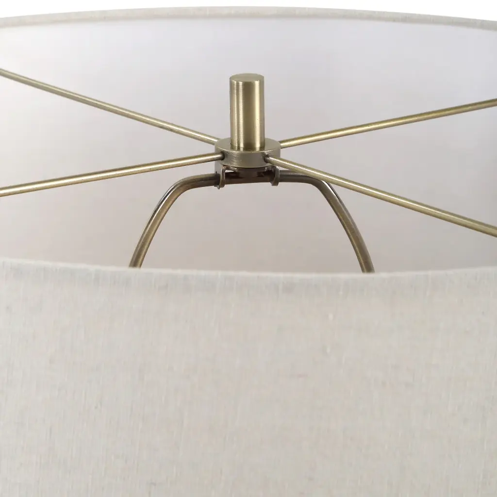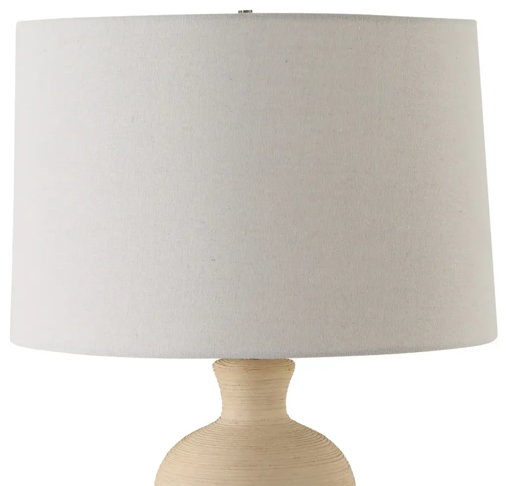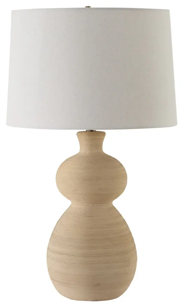 The Pueblo Table Lamp Combines The Rustic Beauty Of The Southwest With A Touch Of Timeless Elegance And Classic Silhouette. Crafted With A Heavily Textured Ceramic Base In A Warm Organic Clay Finish And Enhanced With Plated Brushed Antique Brass Details. The Slightly Tapered Round Drum Hardback Shade Is A Light Beige Linen Fabric.