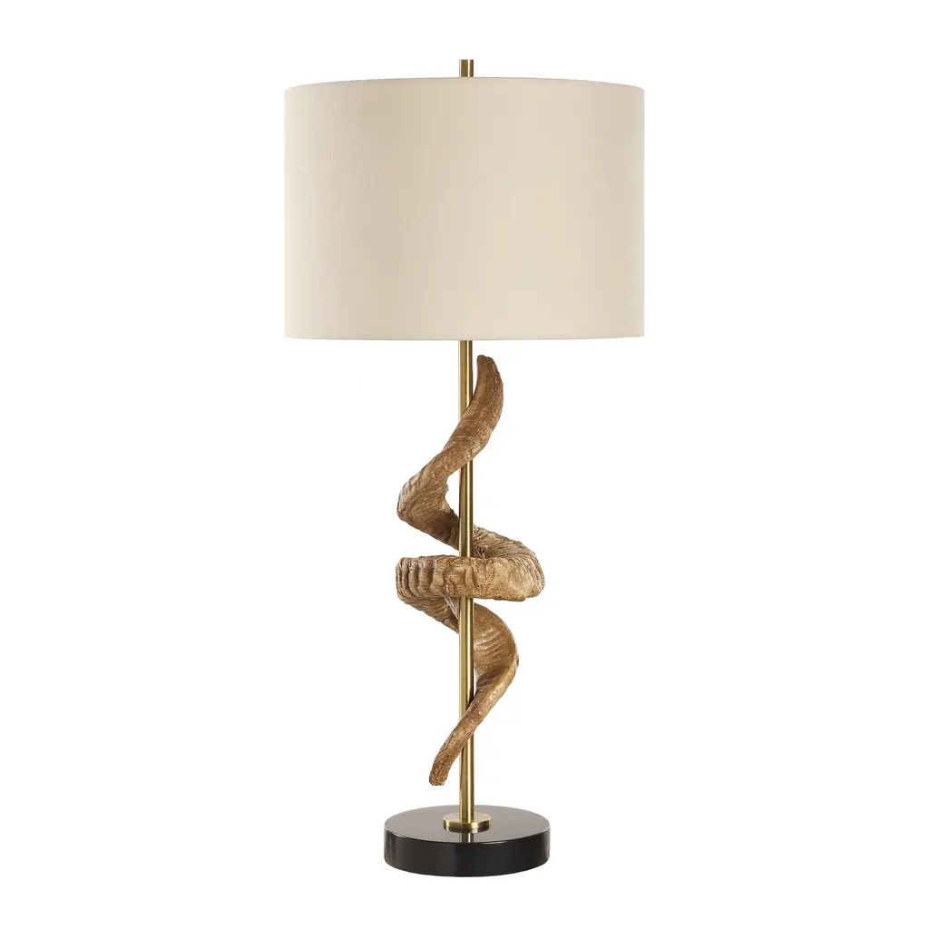This Eye-catching Table Lamp Showcases A Sculpture Inspired By A Rams Horn Displayed Around A Plated Antique Brass Column And A Thick Black Marble Foot. A Round Hardback Drum Shade Made With An Off-white Linen Fabric Completes The Piece. Uttermost's Lamps Combine Premium Quality Materials With Unique High-style Design. With The Advanced Product Engineering And Packaging Reinforcement, Uttermost Maintains Some Of The Lowest Damage Rates In The Industry. Each Product Is Designed, Manufactured And Packaged With Shipping In Mind. Features: Include: One (1) Table Lamp Collection: Rams Material: Steel, Marble, Fabric, Resin Made in China Dimentions: 15 W x 15 D x 33.5 H Item weight: 12 lbs This product will ship to you in one (1) box. Accessories pictured are NOT included. WARNING: This product can expose you to chemicals including nickel which is known to the State of California to cause cancer. For more information, go to www.p65warnings.ca.gov/furniture.