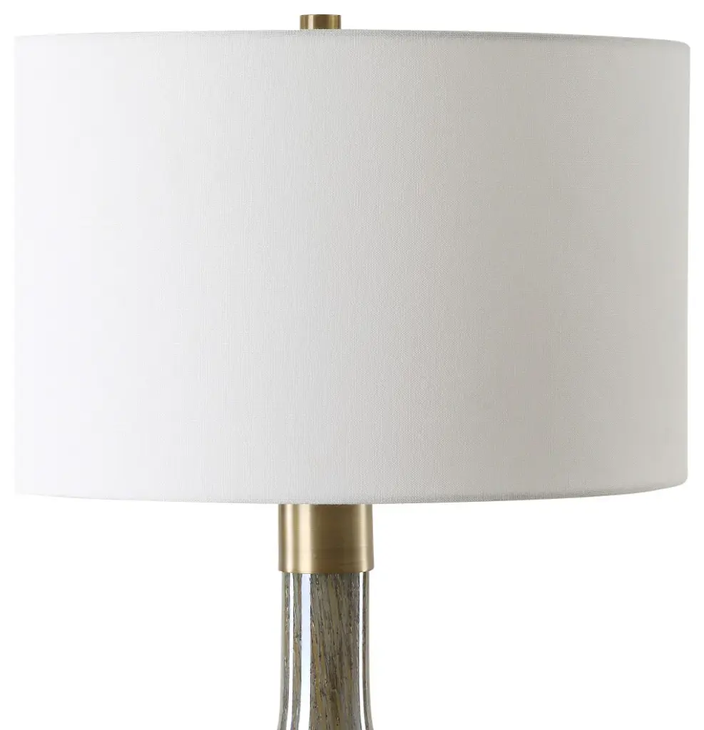The Rhine Table Lamp Showcases A Seeded Glass Body In Warm Tones Of Light And Dark Browns Paired With Smoke Gray, Accented With Plated Antique Brass Details. The Round Hardback Drum Shade Is A Crisp White Linen Fabric.