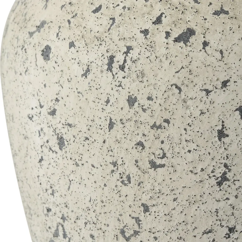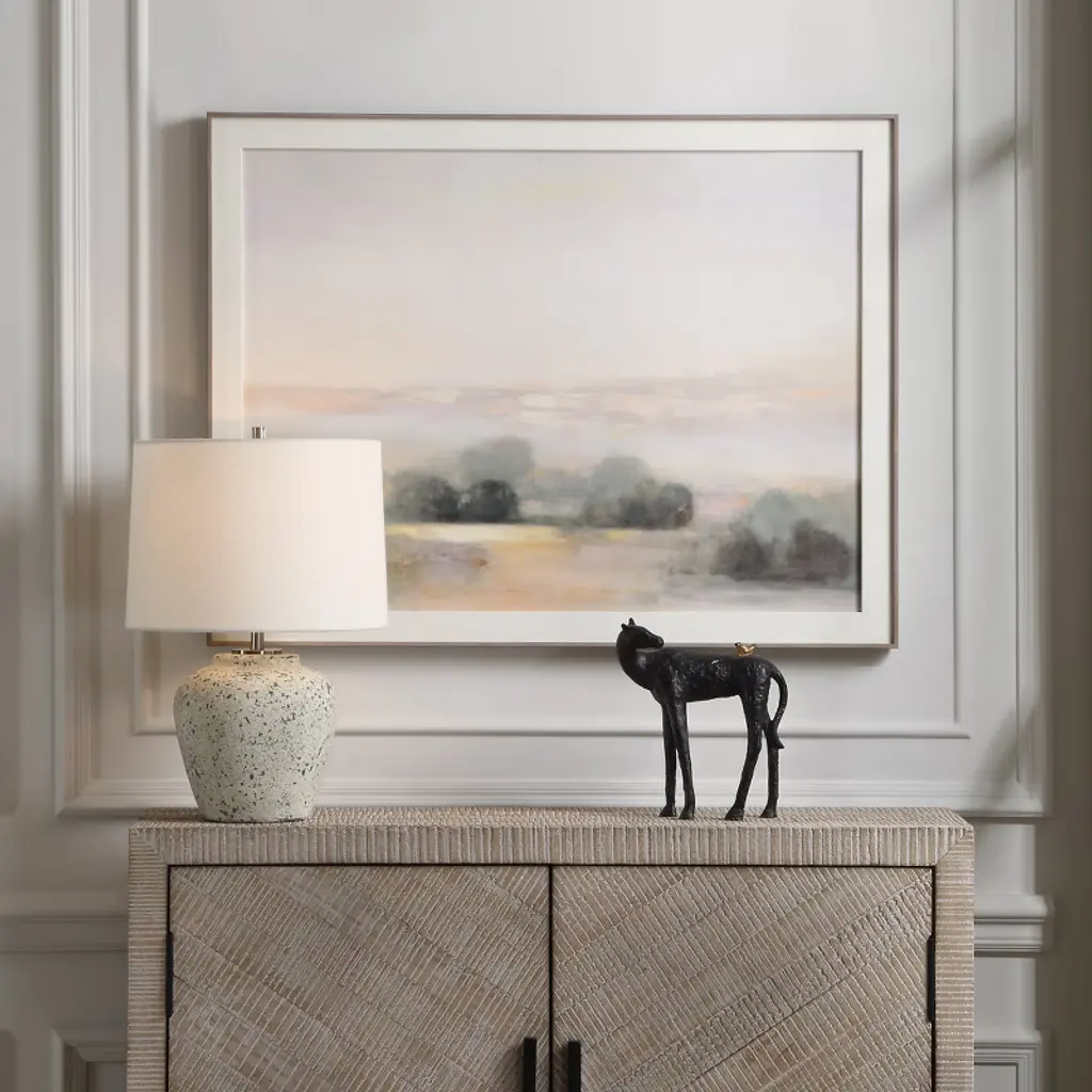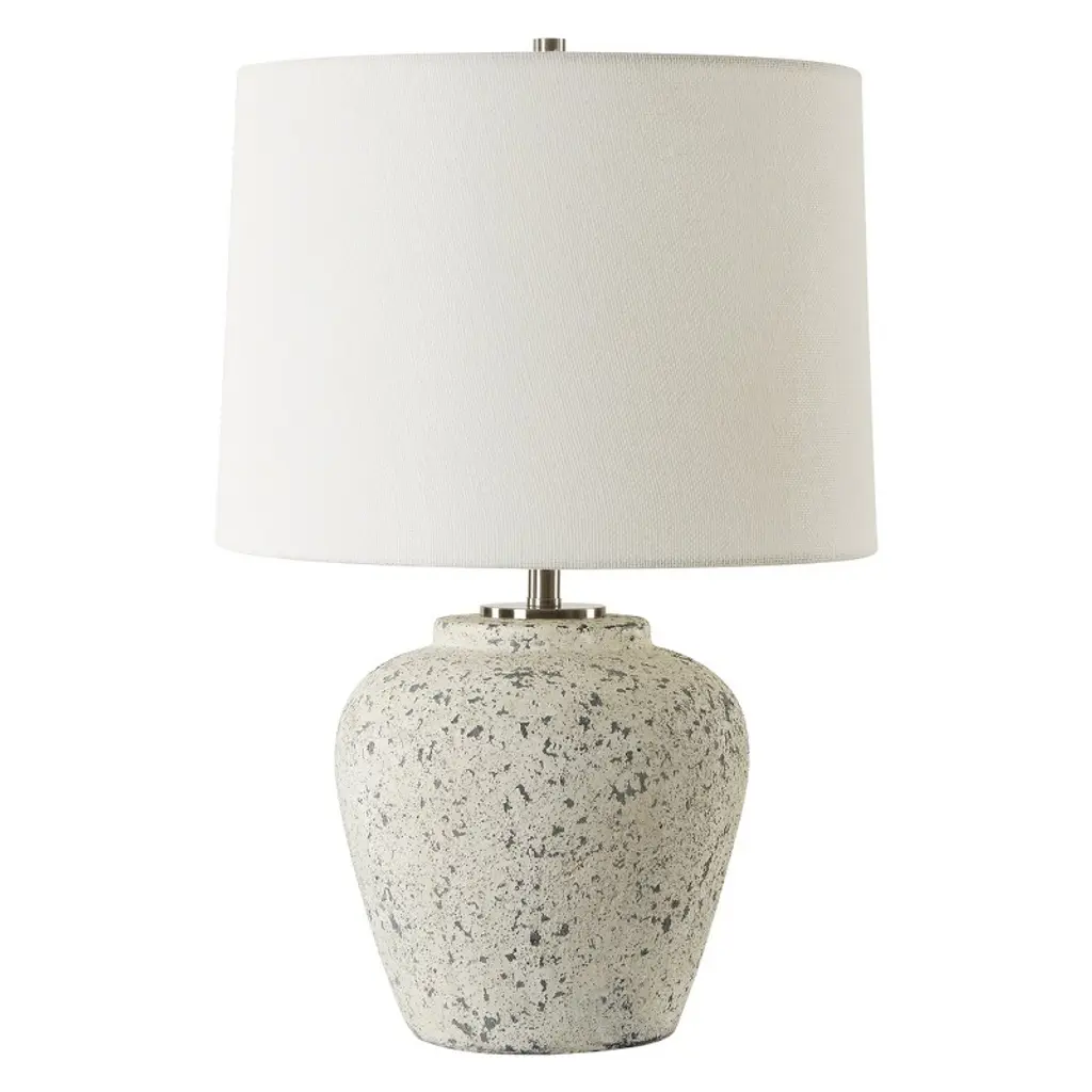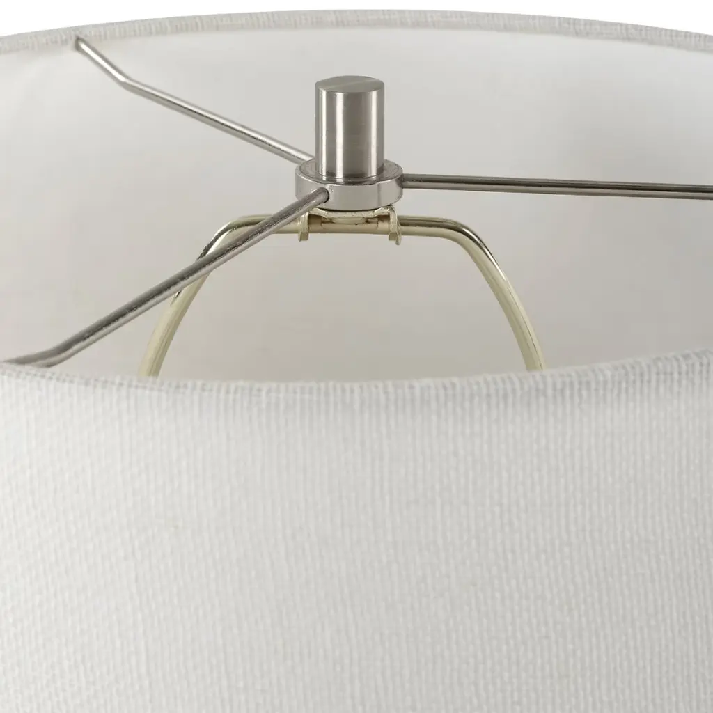 The Rupture Aged Ivory Table Lamp combines a rustic aged look with contemporary elegance. Featuring a heavily distressed aged ivory finish with stone gray undertones, its textured surface exudes vintage charm. Brushed nickel plated accents complement the base, adding a subtle modern touch. Topped with a slightly tapered round hardback shade in crisp white linen, this table lamp provides warm and inviting illumination, making it perfect for bedrooms, living rooms, or reading nooks. Key Features: Heavily distressed aged ivory finish with stone gray undertones. Brushed nickel plated accents for a refined look. Crisp white linen hardback shade for soft light diffusion. E26 bulb socket with on-off switch and 100W maximum wattage. Dimensions: Lamp – 19 H in; Shade – 9 H x 13 Dia. in; weight – 11 lbs.