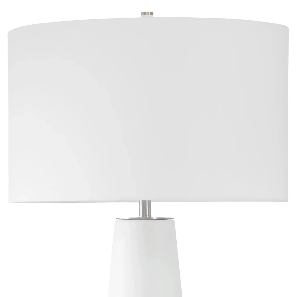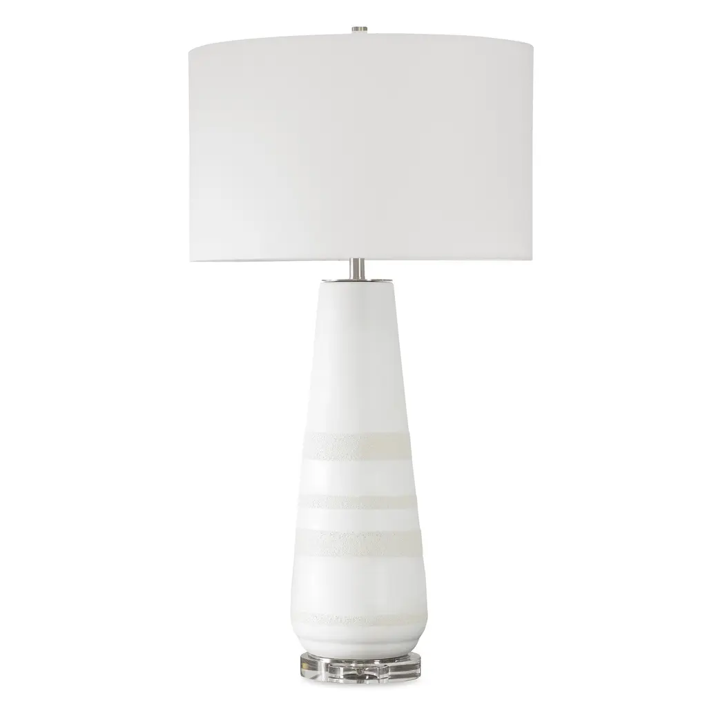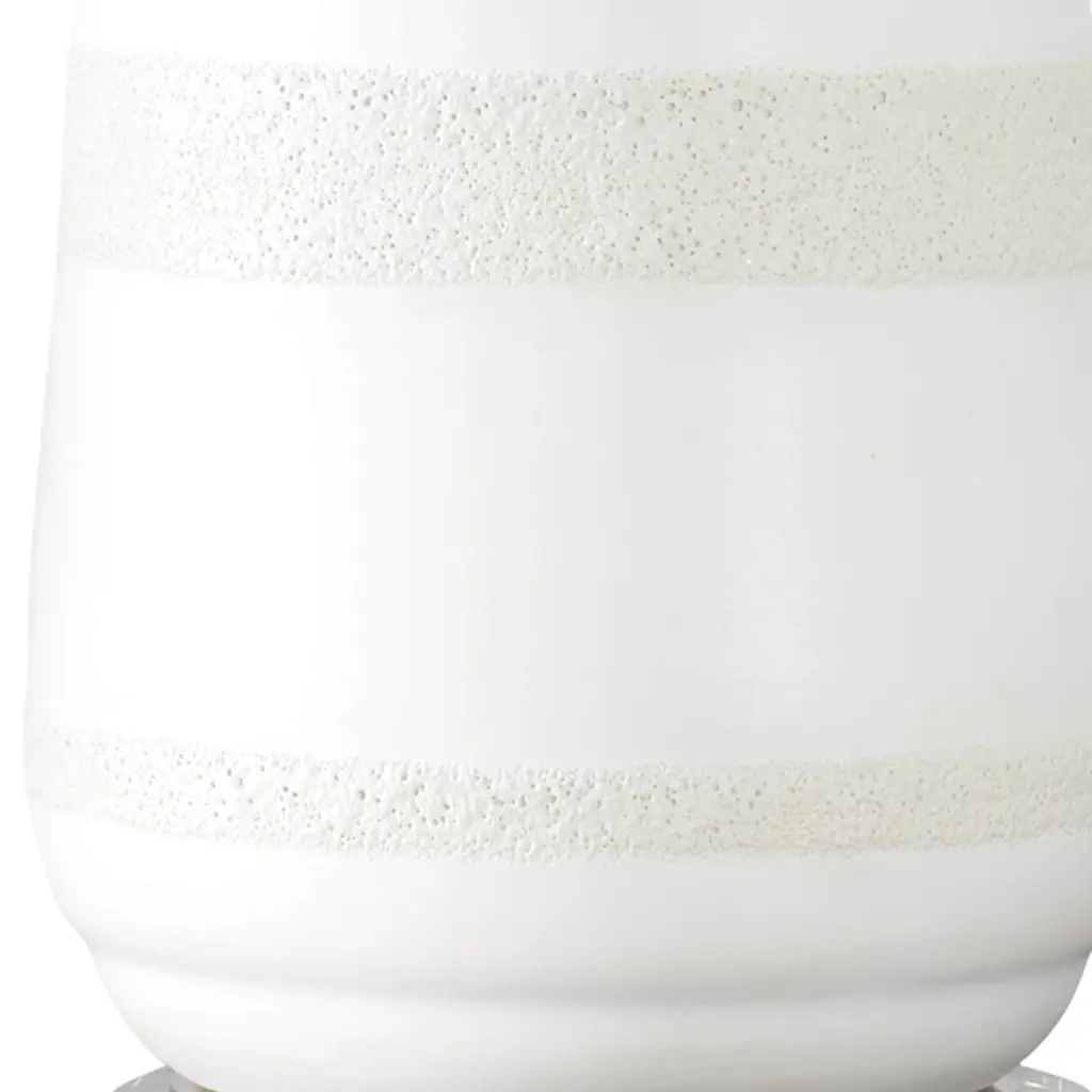 Showcasing a crackled ivory ceramic base with heavily textured dove gray bands for a touch of earthy elegance. Resting on a thick crystal foot and accented with brushed plated nickel finishes, this lamp brings a serene sophistication to any room. The round drum shade is covered in a crisp white linen fabric. Due to the nature of fired glazes on ceramic lamps, finishes will vary slightly.Uttermost's lamps combine premium quality materials with unique high-style design.With the advanced product engineering and packaging reinforcement, Uttermost maintains some of the lowest damage rates in the industry. Each product is designed, manufactured and packaged with shipping in mind. Features: Set include: One (1) Table Lamp Collection: Santino Designer: Grace Feyock Color: Ivory Material: Ceramic, Fabric, Metal Shade: Drum with liner Wattage: 150W Socket Type: 3-way Made in Vietnam No assembly required Dimensions: Dimensions: 17 inches deep x 17 inches wide x 31 inches high Item weight: 13 lbs This product will be shipped to you in one (1) box. Warning: This product can expose you to chemicals including nickel which is known to the State of California to cause cancer. For more information, go to www.P65Warnings.ca.gov/furniture.