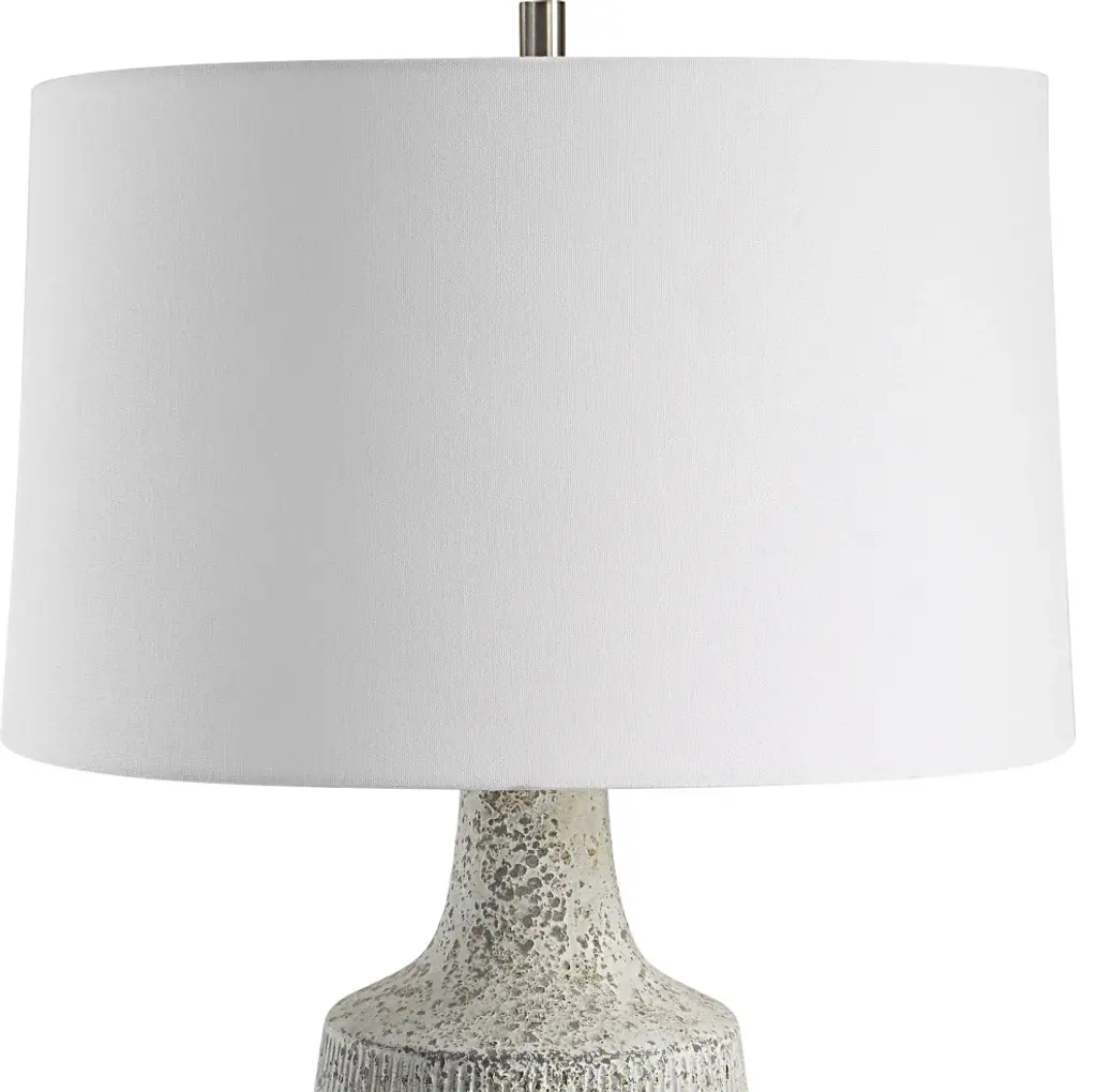 Drawing Inspiration From Antique Clay Pottery, This Table Lamp Is Handcrafted From Ceramic In A Mottled Gray And Off-white Matte Glaze With Subtle Carved Details. Steel Accents Are Finished In Brushed Nickel. The Hardback Drum Shade Is Covered In A Casual White Fabric. Uttermost''s Lamps Combine Premium Quality Materials With Unique High-style Design. With The Advanced Product Engineering And Packaging Reinforcement, Uttermost Maintains Some Of The Lowest Damage Rates In The Industry. Each Product Is Designed, Manufactured And Packaged With Shipping In Mind. DimensionsDepth: 17 in. Width: 17 in. Height: 28. 5 in.
