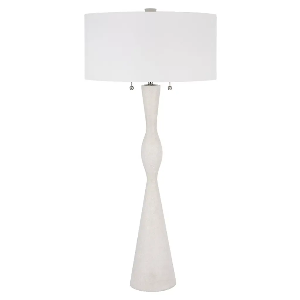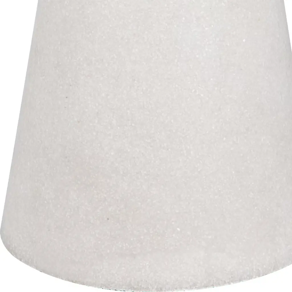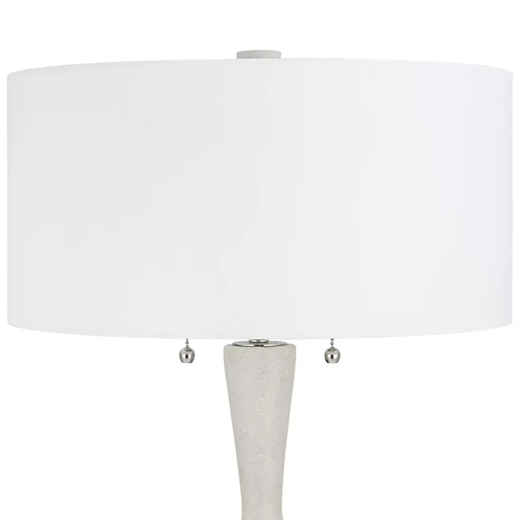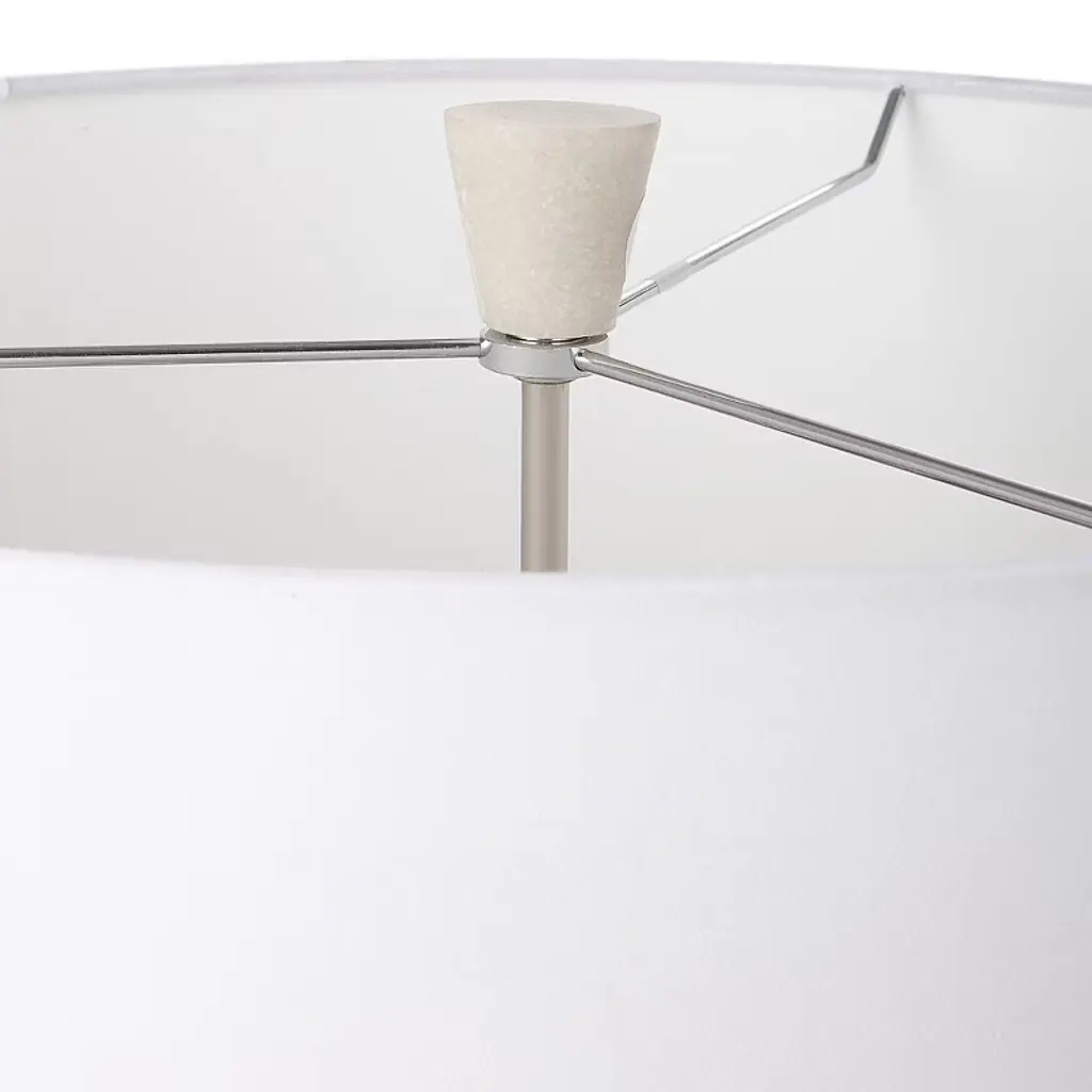 Bring timeless elegance to any room with the Uttermost Sharma Ivory Stone Table Lamp. Crafted from man-made ivory stone that authentically replicates the look of Thassos marble, the lamp is accented with polished nickel iron details for a refined, contemporary style. Its round hardback drum shade in white linen fabric softly diffuses light, creating a warm, inviting ambiance. Measuring 38.5"H × 18"W × 18"D, this lamp is perfect for nightstands, desks, or living room tabletops, combining sculptural beauty with functional illumination for modern and transitional interiors. Product Features: Material: Man-made ivory stone base, iron accents, linen shadeColor: Ivory stone with polished nickel, white shadeFinish/Frame: Polished nickel iron details with marble-like resinDimensions: 38.5"H × 18"W × 18"DShade: Round hardback drum, 9"H, top 18"W × 18"D, bottom 18"W × 18"DBulb: 60W, 2 TYPE A, on/off socketStyle Match: Contemporary, modern, transitional interiors