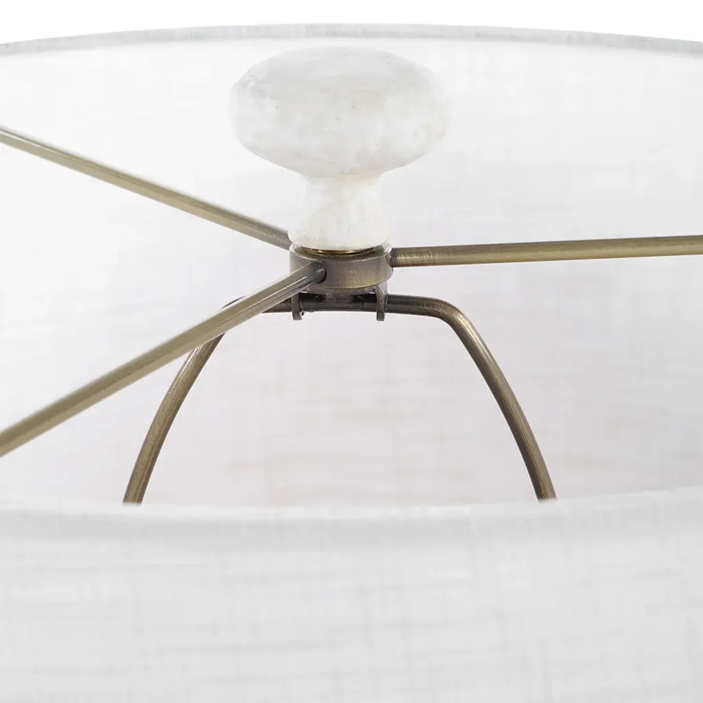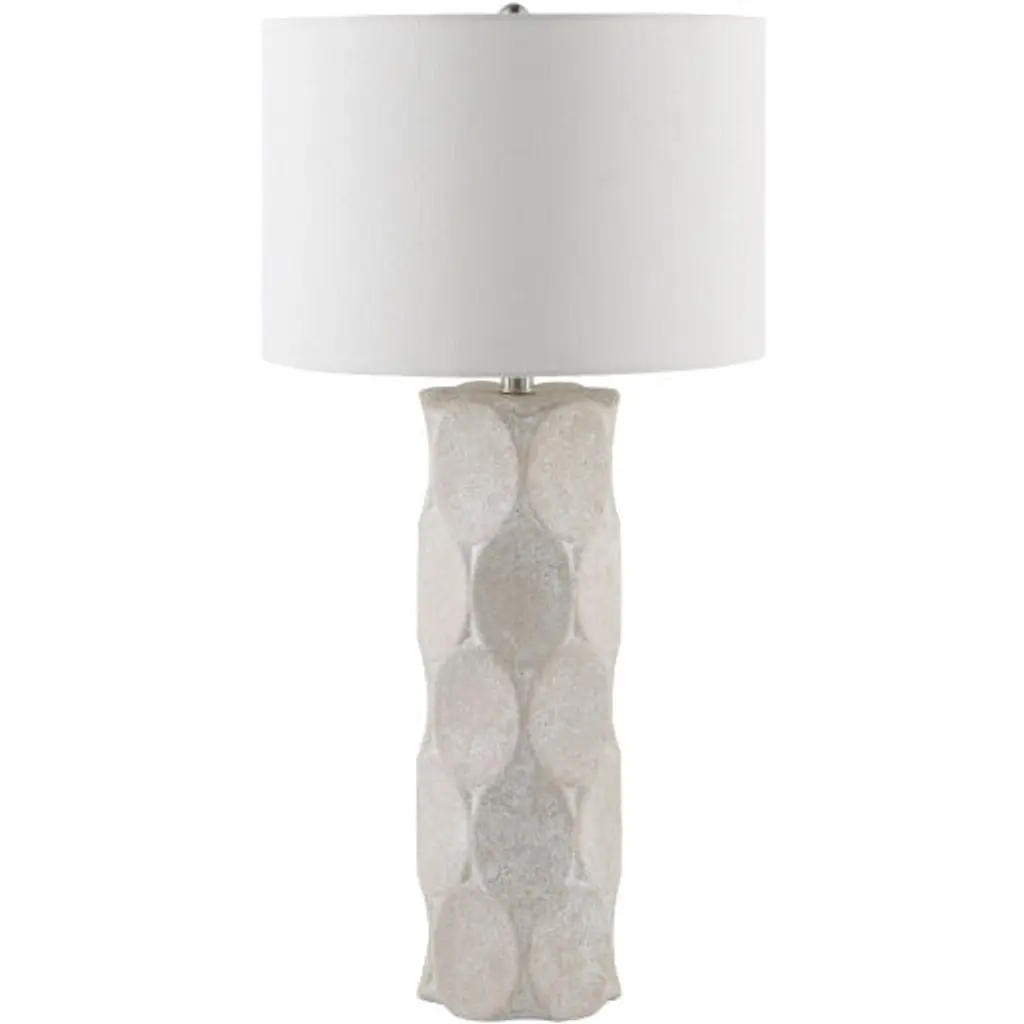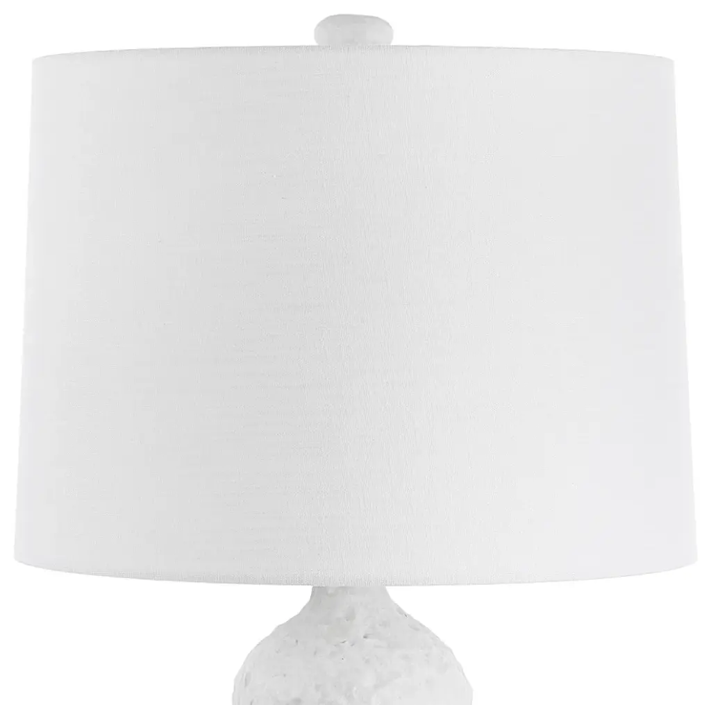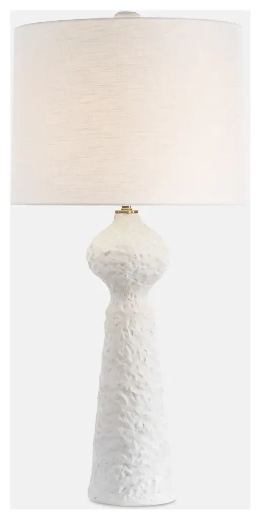 The Sonata Table Lamp Features A Heavily Textured Ceramic Base With A Stone Ivory Finish, Paired With A Matching Large Finial And Brass Plated Accents. The Slightly Tapered Round Hardback Shade Is Covered In An Off-white Linen Fabric With Light Slubbing.