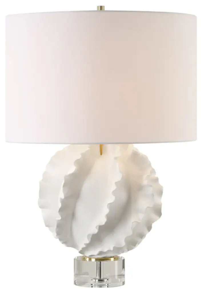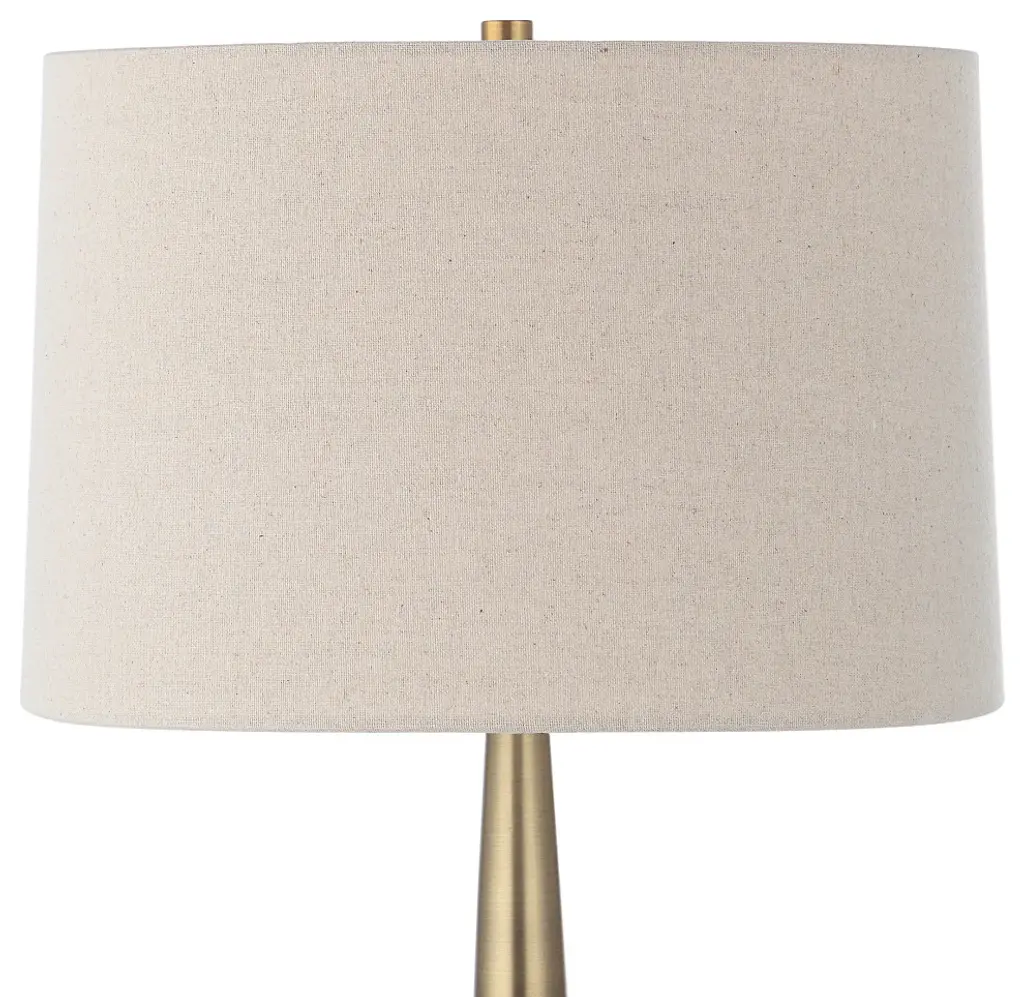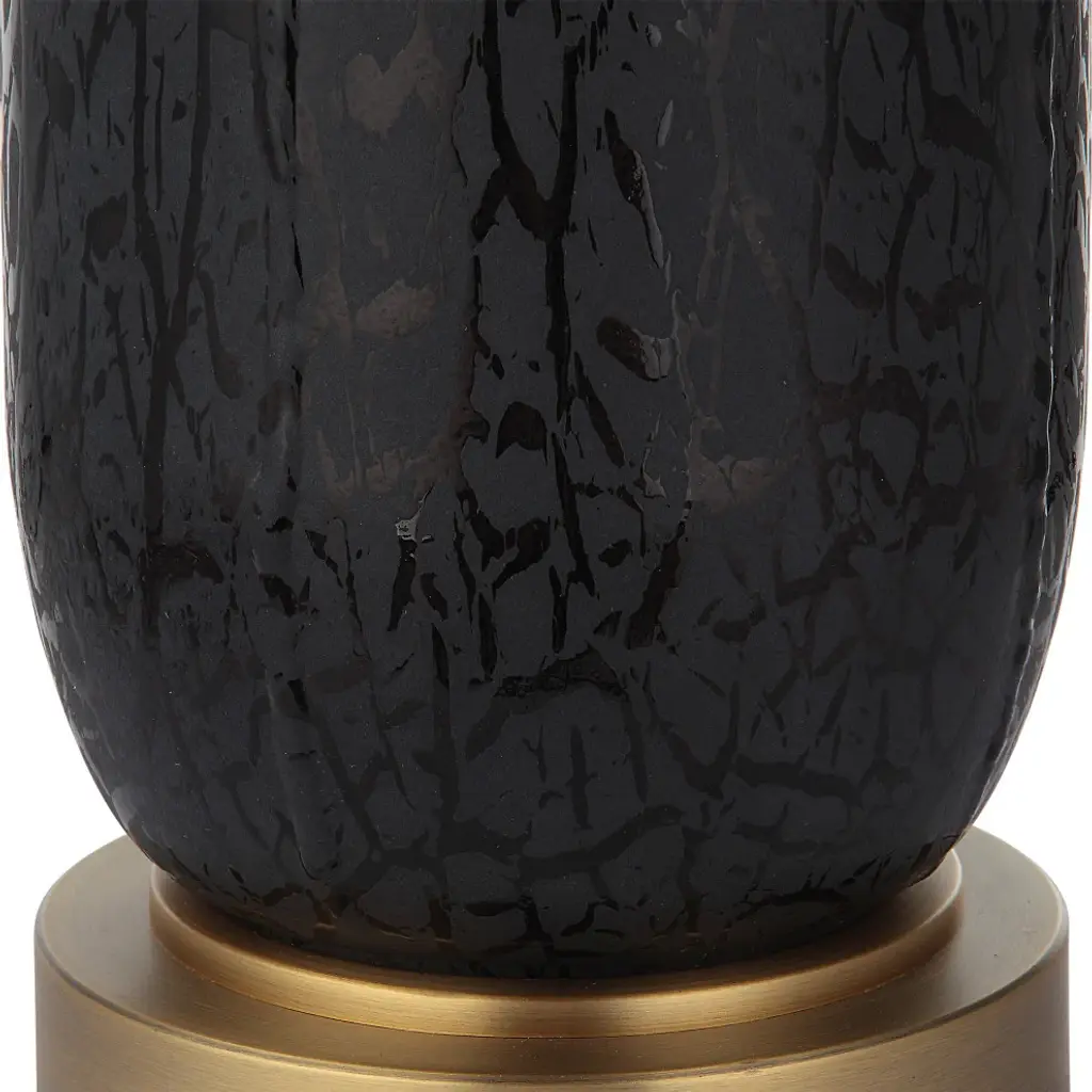 The Spyglass Table Lamp Features A Matte Black Glass Base With Polished Black Woodgrain-like Etching, Paired With Lightly Antiqued Brass Plated Foot And Hardware. The Round Hardback Shade Is Covered In A Light Beige Linen Fabric.
