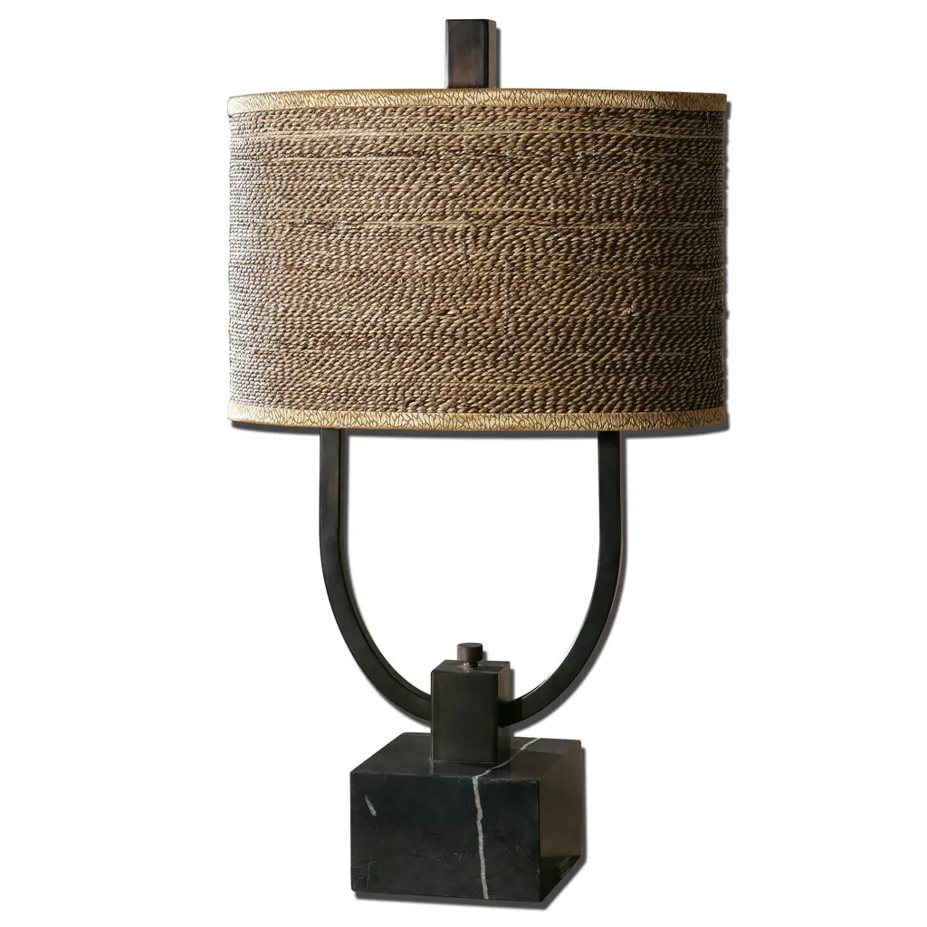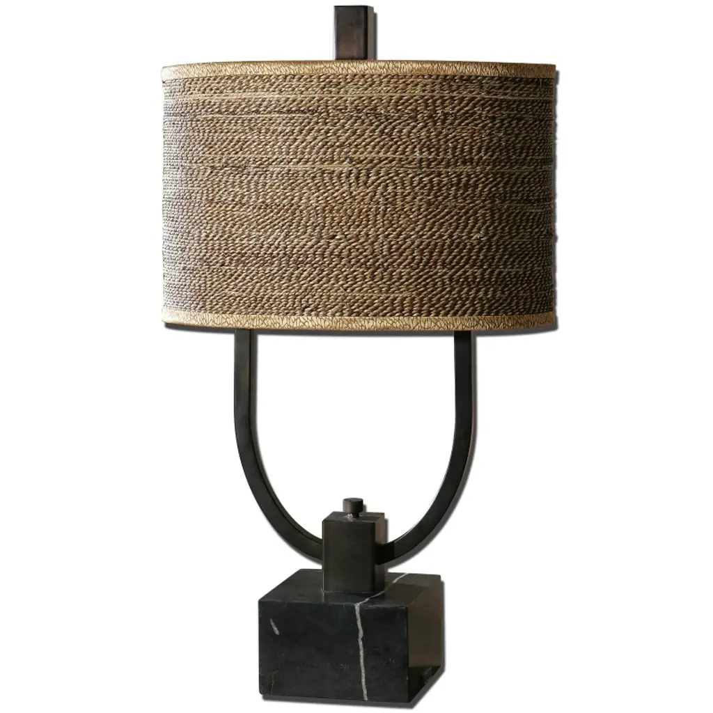Rustic Bronze Metal With Burnished Edges And A Black Marble Foot. The Oval Drum Shade Is Brown And Tan Woven Rattan With Decorative Trim. Uttermost''s Lamps Combine Premium Quality Materials With Unique High-style Design. With The Advanced Product Engineering And Packaging Reinforcement, Uttermost Maintains Some Of The Lowest Damage Rates In The Industry. Each Product Is Designed, Manufactured And Packaged With Shipping In Mind. DimensionsDepth: 10 in. Width: 17 in. Height: 29. 5 in.