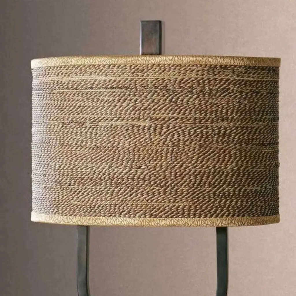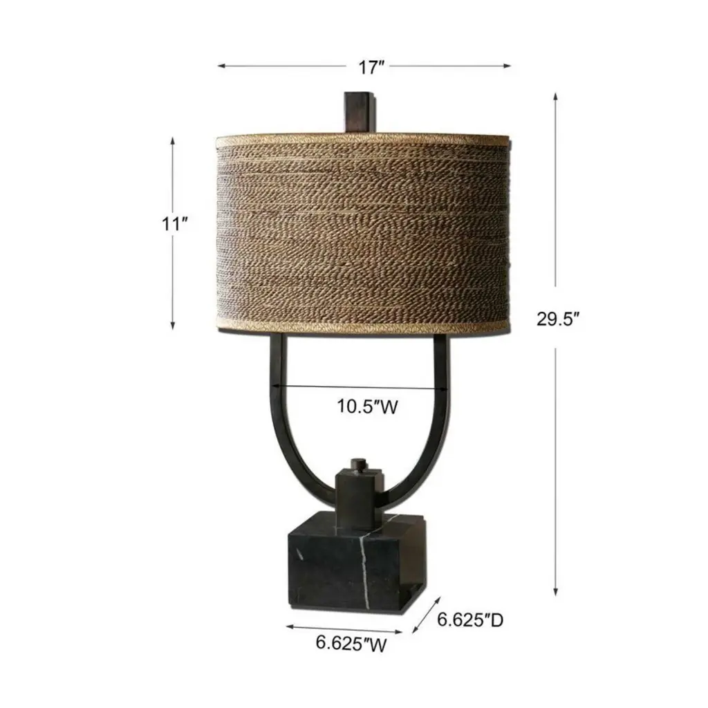 A compelling fusion of rustic elegance and organic texture, the Stabina Table Lamp features a rustic bronze metal body with burnished edges for timeworn appeal. Anchored by a striking black marble foot, the design is elevated by an oval drum shade wrapped in brown and tan woven rattan, complete with decorative trim. This piece brings warmth, character, and artisanal detail to transitional, lodge, or nature-inspired interiors. Key Features: Rustic bronze metal body with burnished detailing for vintage charmContrasting black marble base adds visual weight and eleganceOval rattan drum shade with woven texture and decorative trimDual bulb setup with convenient base-mounted on-off switchDimensions: 30"H | Shade: 11"H x 17"W x 10"D |Weight: 31 lbs Perfect for earthy interiors seeking a refined, handcrafted presence.