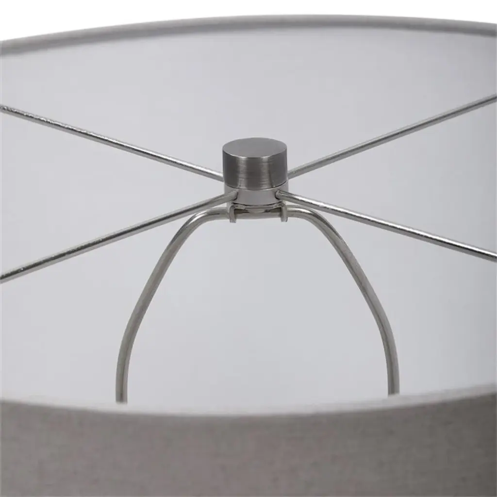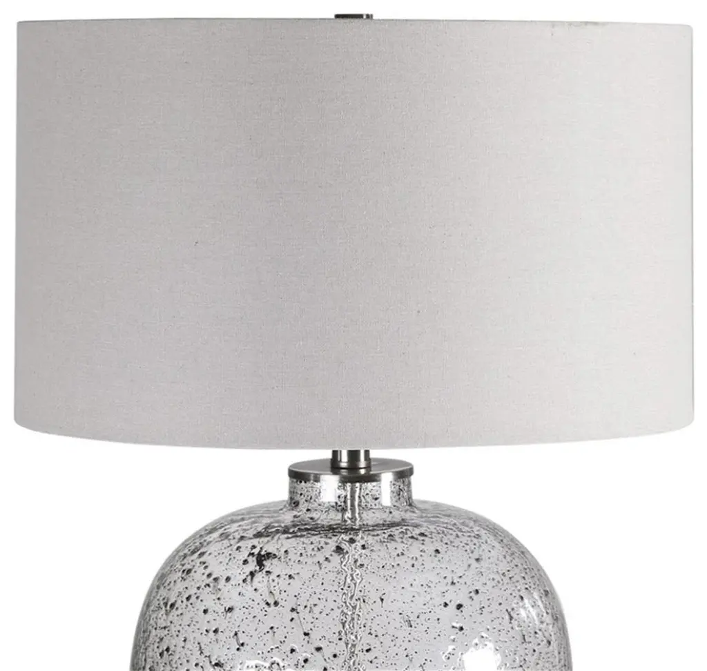 Modern Style Table Lamp Features A Translucent Art Glass Base With Abstract Black Flecks Throughout, Accented With Brushed Nickel Details. The Round Hardback Drum Shade Is A Light Gray Linen Fabric With Natural Slubbing. Uttermost''s Lamps Combine Premium Quality Materials With Unique High-style Design. With The Advanced Product Engineering And Packaging Reinforcement, Uttermost Maintains Some Of The Lowest Damage Rates In The Industry. Each Product Is Designed, Manufactured And Packaged With Shipping In Mind. DimensionsDepth: 17 in. Width: 17 in. Height: 23. 25 in.