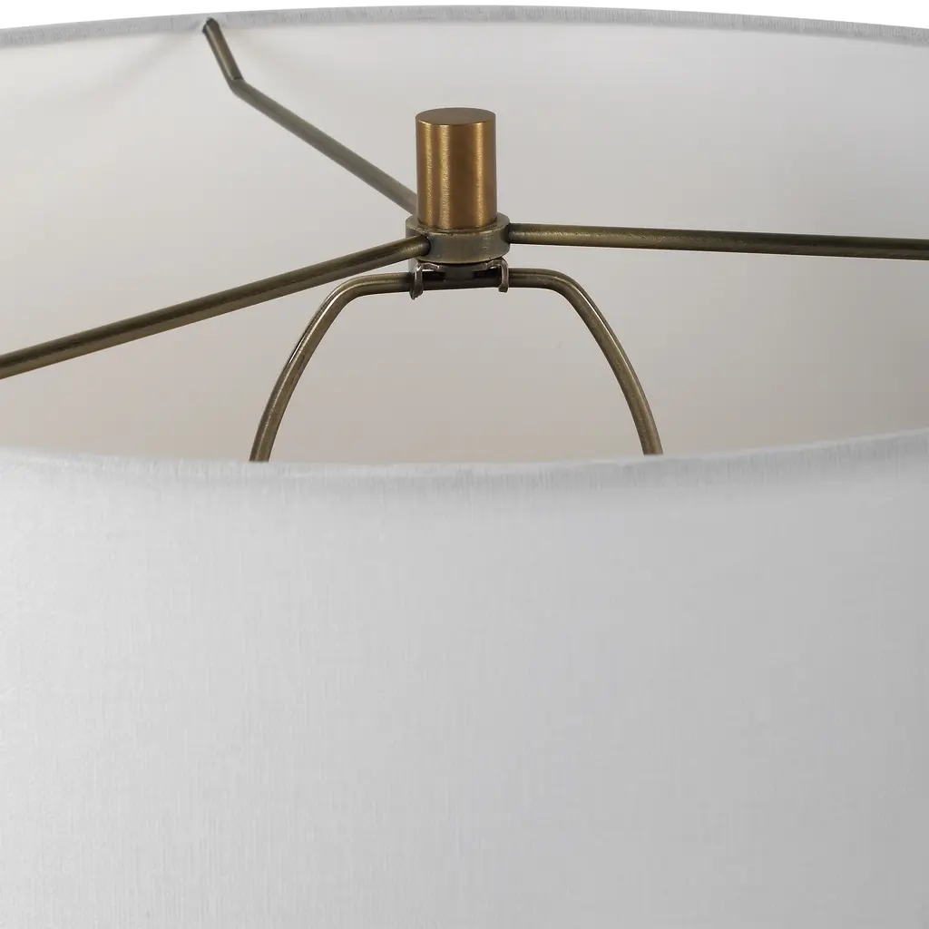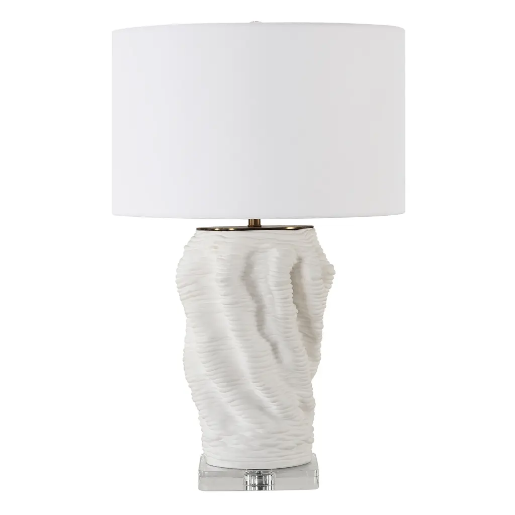 This unique silhouette creates a modern look with its organic, free flowing shape. Combining sculpture and functionality, this ceramic vase, featuring layers of organically shaped stacked rings, finished in a matte white glaze, accented with brass plated details and a thick crystal foot. The round drum shade is a crisp white linen fabric.Uttermost's lamps combine premium quality materials with unique high-style design.With the advanced product engineering and packaging reinforcement, Uttermost maintains some of the lowest damage rates in the industry. Each product is designed, manufactured and packaged with shipping in mind. Features: Set include: One (1) Table Lamp Collection: Stratified Designer: Matthew Williams Color: White Material: Ceramic, Crystal, Steel, Fabric Finish/Frame: Brass Shade: Round hardback shade Wattage: 150W Socket Type: 3-way Made in China No assembly required Dimensions: Dimensions: 18 inches deep x 18 inches wide x 28 inches high Item weight: 19.14 lbs This product will be shipped to you in one (1) box. Warning: This product can expose you to chemicals including nickel which is known to the State of California to cause cancer. For more information, go to www.P65Warnings.ca.gov/furniture.