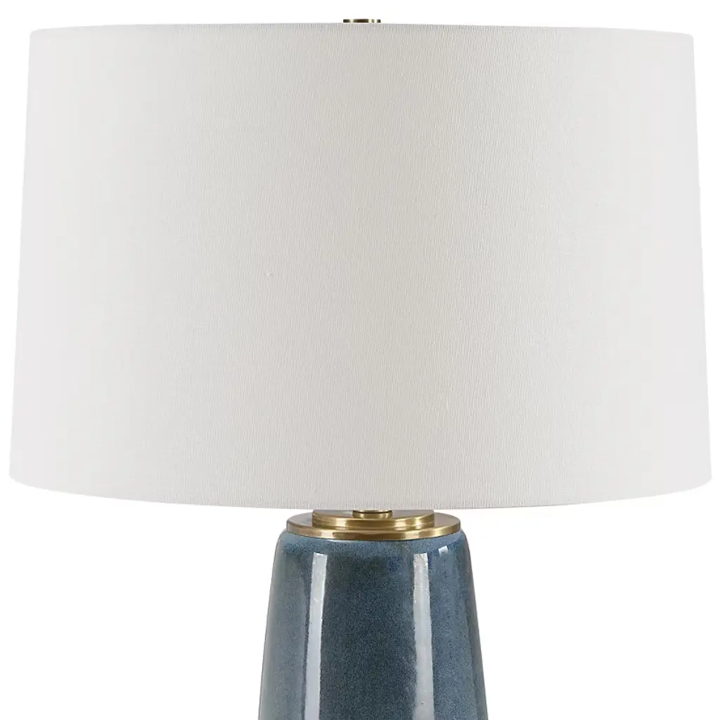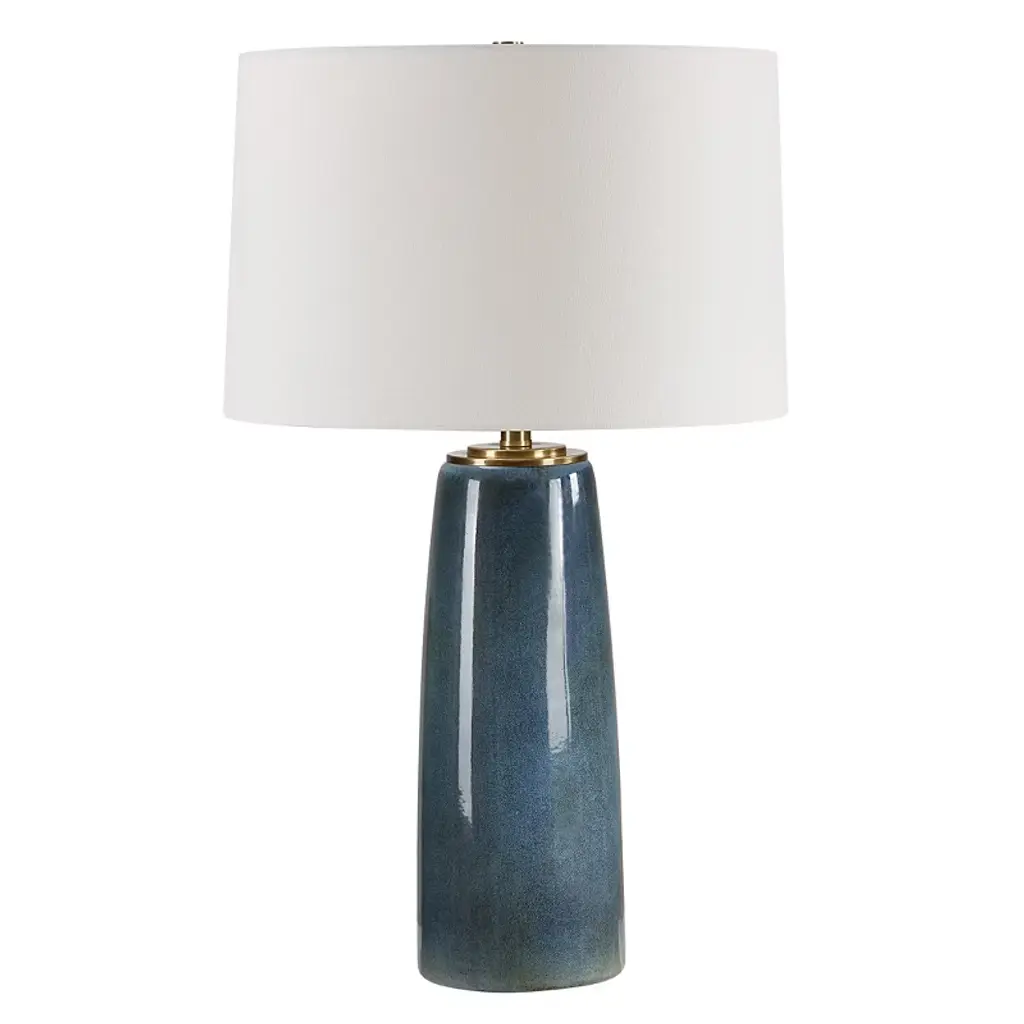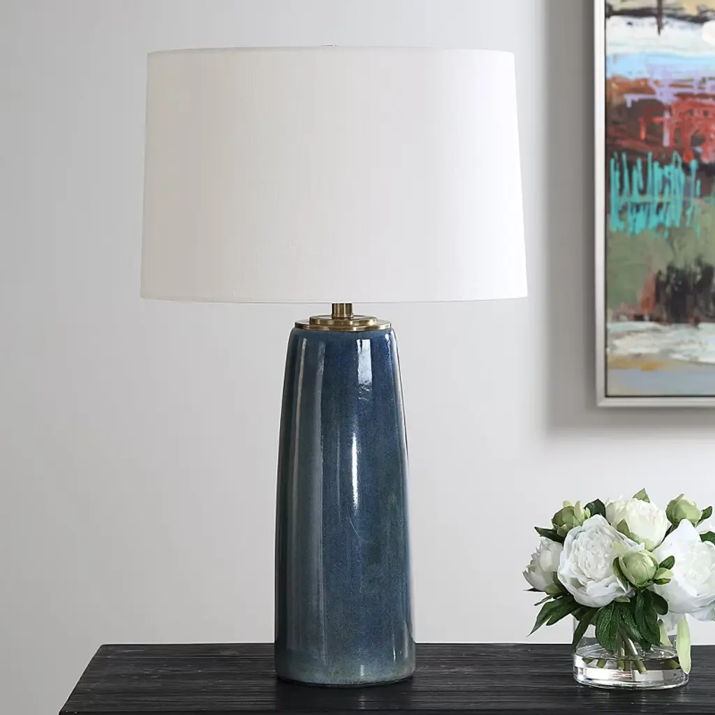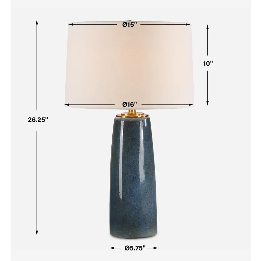 The Submerged Deep Blue Ceramic Table Lamp combines rich tones and refined design, featuring a deep blue glaze with rustic undertones for a striking artistic look. Plated antique brass details add a touch of warmth and sophistication, while the slightly tapered round hardback shade in crisp white linen offers a soft contrast. Due to the handcrafted nature of ceramic glazes, each lamp boasts unique variations in finish, making it a one-of-a-kind accent for your living room, bedroom, or study. Key Features: Deep blue ceramic body with rustic undertones for artistic appeal. Plated antique brass accents enhance the luxurious design. Crisp white linen shade softens light for a warm ambiance. Unique glaze variations ensure each lamp is one-of-a-kind. Dimensions: 26H; Shade 10H x 16 Dia. (in); weight – 11 lbs.