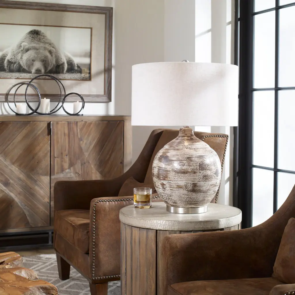 Heavily Textured Ceramic Base Finished In A Distressed Blue-gray Glaze With Rust Bronze Undertones, Accented With Brushed Nickel Plated Details. The Round Hardback Drum Shade Is A Light Beige Linen Fabric With Natural Slubbing. Uttermost''s Lamps Combine Premium Quality Materials With Unique High-style Design. With The Advanced Product Engineering And Packaging Reinforcement, Uttermost Maintains Some Of The Lowest Damage Rates In The Industry. Each Product Is Designed, Manufactured And Packaged With Shipping In Mind. DimensionsDepth: 19 in. Width: 19 in. Height: 27 in.
