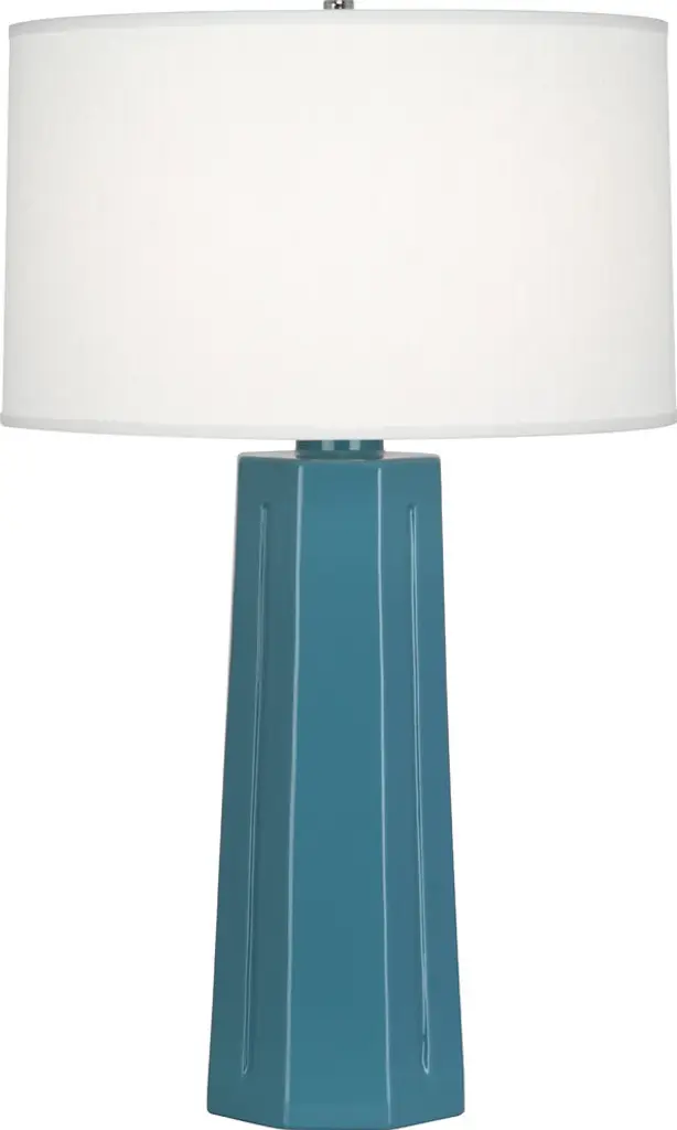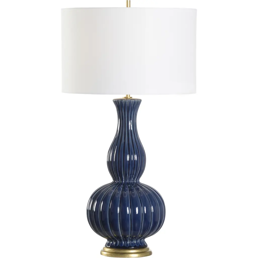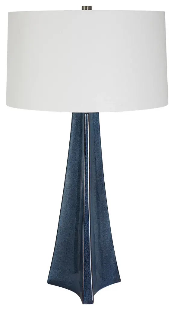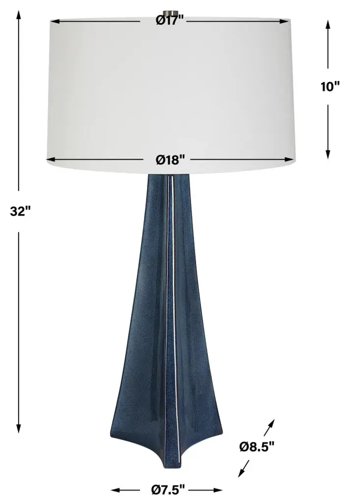 This Tapered Ceramic Base Features Softly Scalloped Sides Finished In A Lightly Distressed Blue Ombre With Subtle Warm Brown Undertones On The Edges, Accented With Plated Brushed Nickel Details. The Slightly Tapered Drum Shade Is Covered In A Crisp White Linen Fabric. Due To The Nature Of Fired Glazes On Ceramic Lamps, Finishes Will Vary Slightly.