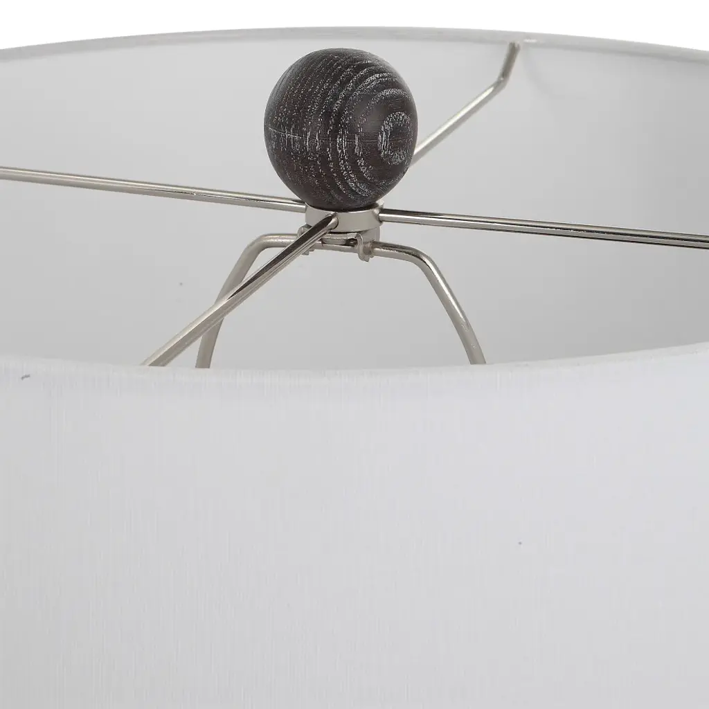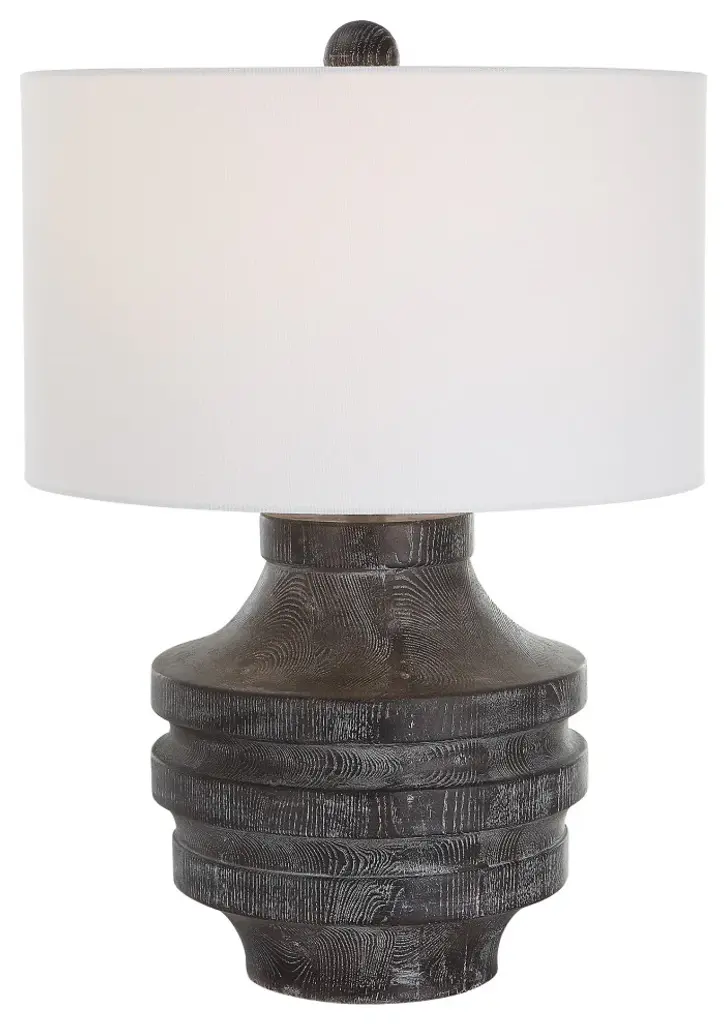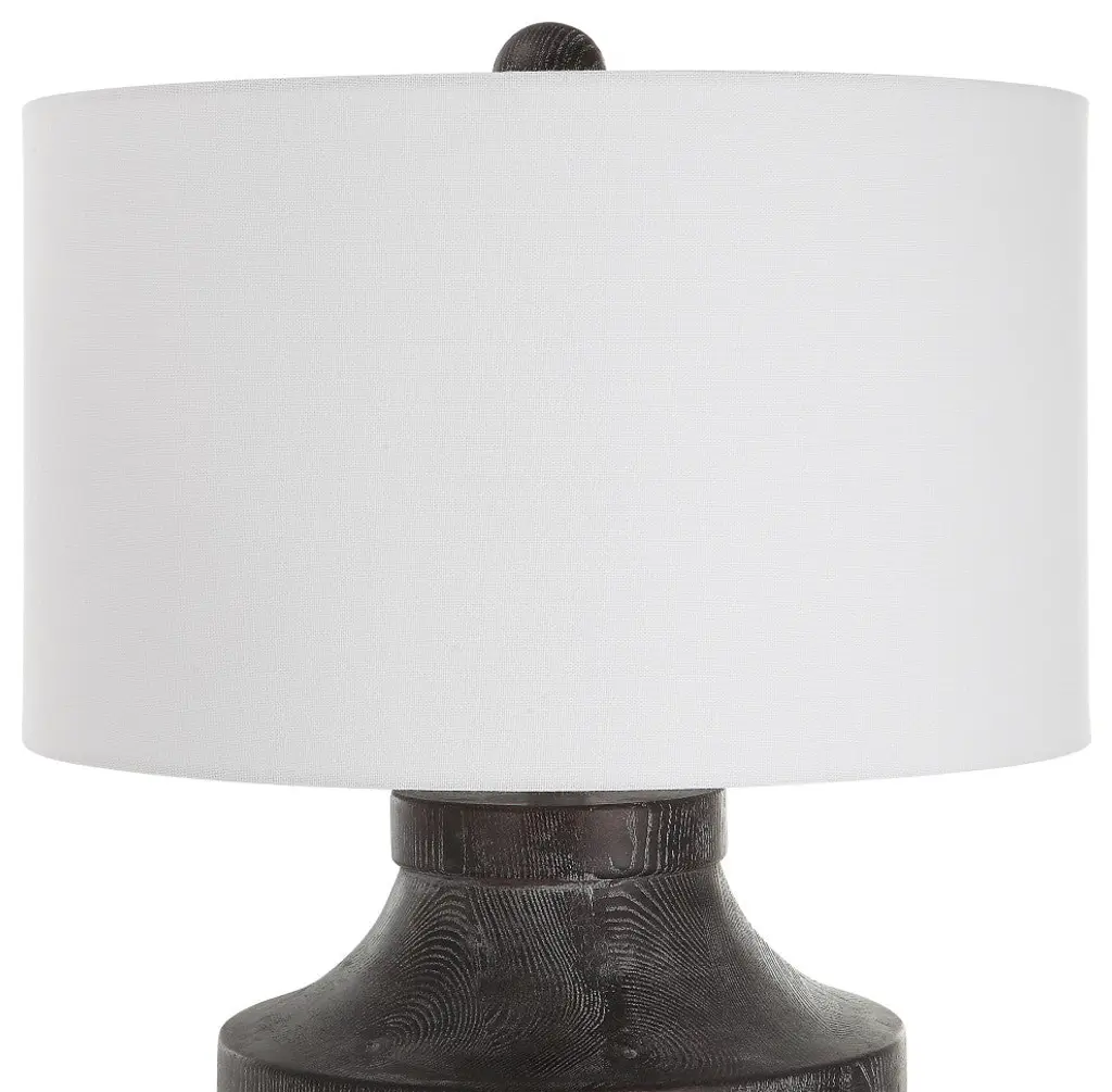 The Perfect Rustic Accent, The Timber Table Lamp Brings The Outdoors In With A Carved Wood Look In A Transparent Black Stain With Warm Undertones And A Light White Glaze Accentuating The Faux Wood Grain. The Hardback Drum Shade Is Covered In A White Cotton Fabric.