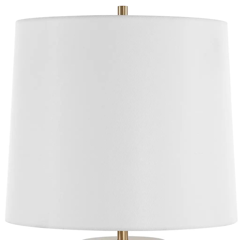 The Trentino Table Lamp Features A Striking Frosted Black Glass Base, Complemented By Lightly Antiqued Brass-plated Accents. The Tapered Round Hardback Shade Is Covered In A Crisp White Linen Fabric. Uttermost's Lamps Combine Premium Quality Materials With Unique High-style Design. With The Advanced Product Engineering And Packaging Reinforcement, Uttermost Maintains Some Of The Lowest Damage Rates In The Industry. Each Product Is Designed, Manufactured And Packaged With Shipping In Mind. Features: Include: One (1) Table Lamp Collection: Trentino Material: Metal, Glass, Linen Made in China Dimentions: 16 W x 16 D x 28 H Item weight: 10 lbs This product will ship to you in one (1) box. Accessories pictured are NOT included. WARNING: This product can expose you to chemicals including nickel which is known to the State of California to cause cancer. For more information, go to www.p65warnings.ca.gov/furniture.