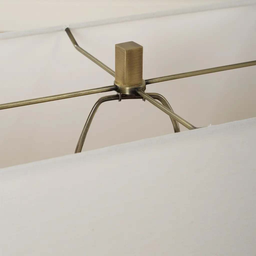 This striking lamp features a u-shaped unfilled honed travertine design, artfully displayed on an slender base finished in an elegant plated brushed antique brass. The rectangle drum shade is covered in a crisp white linen fabric.Uttermost's lamps combine premium quality materials with unique high-style design.With the advanced product engineering and packaging reinforcement, Uttermost maintains some of the lowest damage rates in the industry. Each product is designed, manufactured and packaged with shipping in mind. Features: Set include: One (1) Table Lamp Collection: Turning Point Designer: Jim Parsons Color: Travertine Material: Iron, Travertine, Fabric Finish/Frame: Brass Shade: Rectangle fabric shade Wattage: 150W Socket Type: 3-way Made in China No assembly required Dimensions: Dimensions: 10 inches deep x 17 inches wide x 26 inches high Item weight: 11.5 lbs This product will be shipped to you in one (1) box. Warning: This product can expose you to chemicals including nickel which is known to the State of California to cause cancer. For more information, go to www.P65Warnings.ca.gov/furniture.