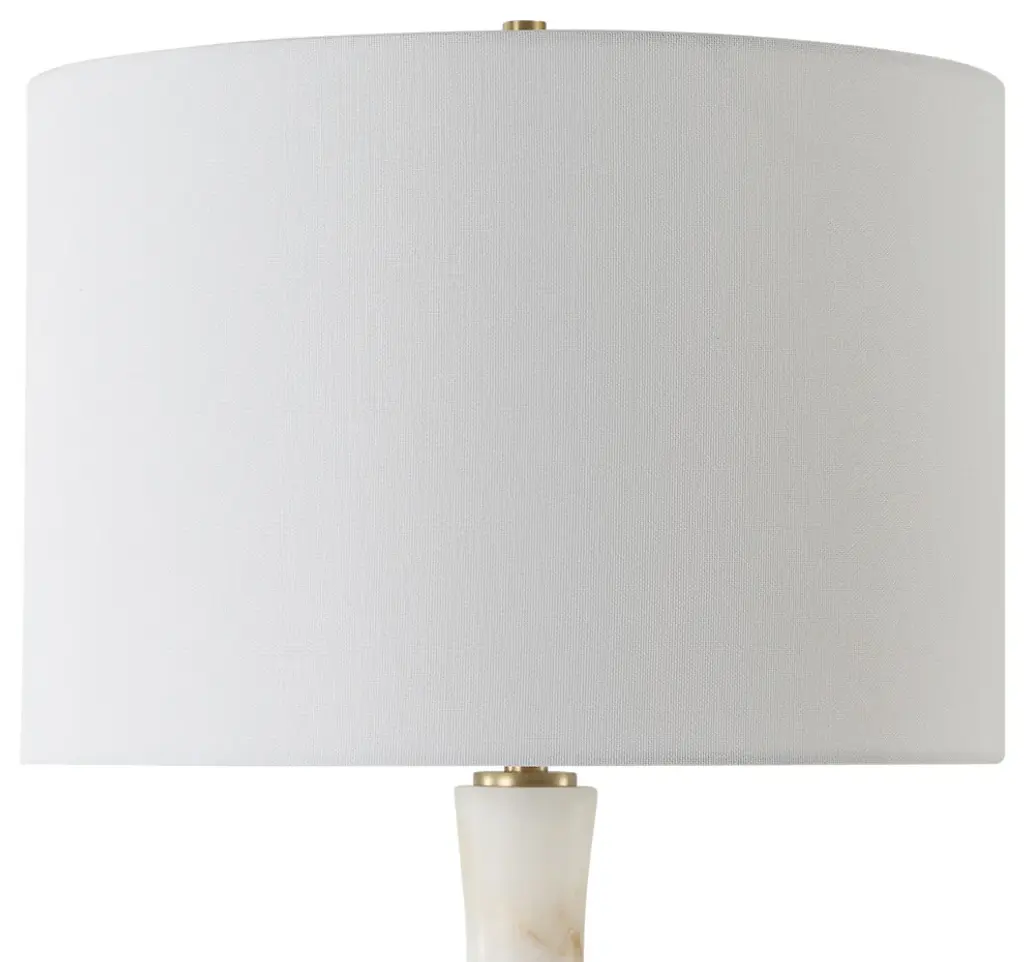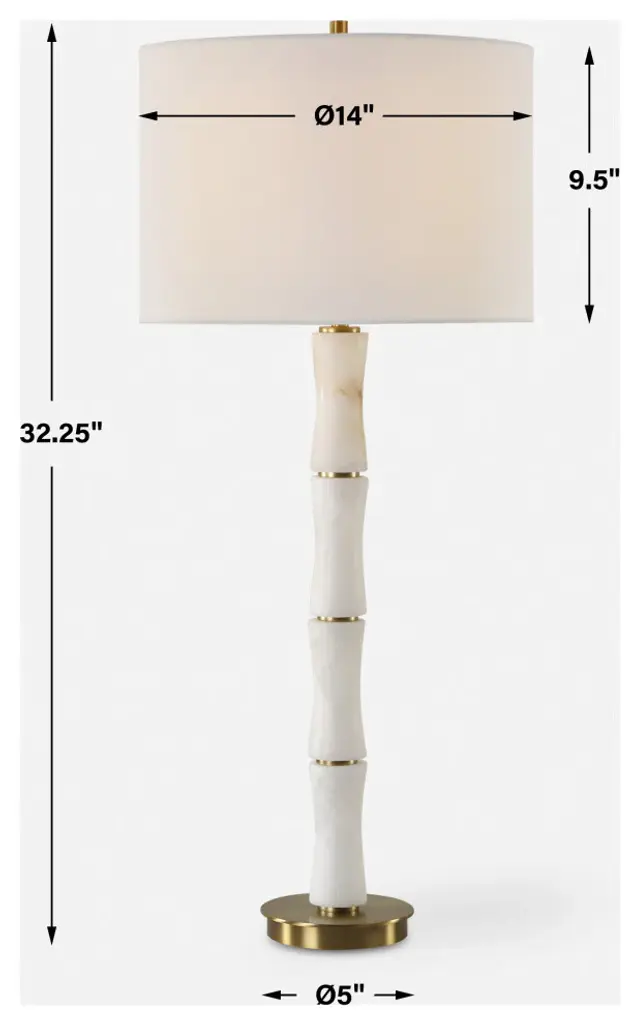 Crafted From Polished Alabaster Meticulously Sculpted Into The Graceful Form Of A Bamboo Shoot, This Table Lamp Exudes Sophistication And Tranquility. Paired With Plated Brass Accents, It Seamlessly Blends Organic Charm With Luxurious Refinement. The Round Hardback Drum Shade Is A Crisp White Linen Fabric.