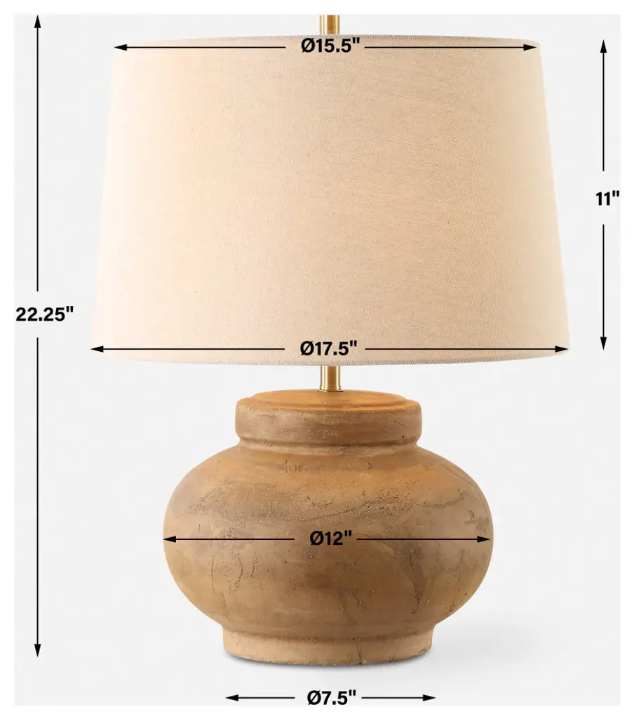 Crafted With A Distressed Terracotta Base, The Urbino Table Lamp Exudes Warmth And Character With Its Earthy Tones And Organic Texture. Accented By Plated Brushed Antique Brass Details. The Round Hardback Shade Is A Natural Linen Fabric With Light Slubbing.