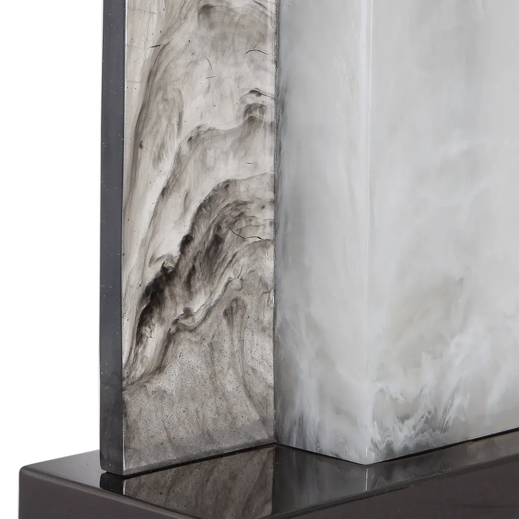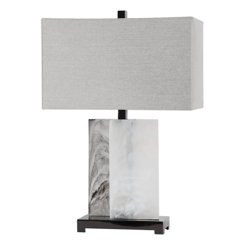 Uttermost's lamps combine premium quality materials with unique high-style design. With the advanced product engineering and packaging reinforcement, Uttermost maintains some of the lowest damage rates in the industry. Each product is designed, manufactured and packaged with shipping in mind. This modern silhouette features two rectangular slabs reminiscent of billowing smoke fastened in an off-set construction accented with polished nickel plated details. The rectangle hardback shade is an off-white and grey linen fabric with natural subbing. Features: Set includes: One (1) table lamp Materials: Steel, Clear Resin and Fabric Finish: Billowing Smoke and Black Special Features: Designer: Renee Wightman Shade description: Rectangle hardback Number of lights: 1 Wattage: 150 W Bulb quantity: 1 Bulb type: Type A Socket type: 3-Way Voltage: 110 V Dimensions: Table lamp dimensions: 26 inches high x 17.5 inches wide x 10 inches deep Shade dimensions: (17.5x10) inches top x (17.5x10) inches bottom x 10.5 inches high This product will ship to you in one (1) box. Accessories pictured are NOT included. WARNING: This product can expose you to chemicals including nickel which is known to the State of California to cause cancer. For more information, go to www.P65Warnings.ca.gov/furniture.