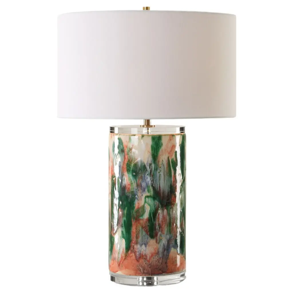 Elevate your space with the painterly elegance of the Verdant Multi-Colored Table Lamp—evoking a hand-painted canvas. Key Features: Multi-hued ceramic base offers an artistic and painterly look Green, blue, and salmon tones bring vibrant sophistication Crystal foot and brass accents lend elegant contrast White linen drum shade provides soft ambient light Dimensions: 28H, Shade 10H x 18 Dia. (in), Weight: 23 lbs