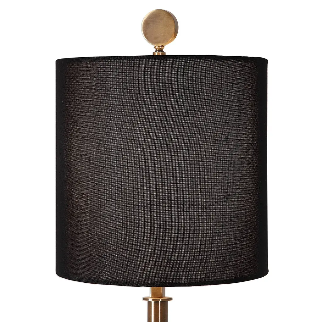 Uttermost's lamps combine premium quality materials with unique high-style design. With the advanced product engineering and packaging reinforcement, Uttermost maintains some of the lowest damage rates in the industry. Each product is designed, manufactured and packaged with shipping in mind. Sleek, modern lines complete this sophisticated design featuring a delicate iron base finished in a plated antique brass, accented with a thick crystal slab and a heavy disk finial. A round hardback drum shade in a black linen fabric completes this versatile piece. Features: Set includes: One (1) table lamp Materials: Iron, Fabric and Crystal Finish: Plated Antique Brass Special Features: Designer: Matthew Williams Shade description: Round hardback drum Number of lights: 1 Wattage: 100 W Bulb quantity: 1 Bulb type: Type A Socket type: On-Off Voltage: 110 V Dimensions: Table lamp dimensions: 34.25 inches high x 9 inches wide x 9 inches deep Shade dimensions: (9x9) inches top x (9x9) inches bottom x 9 inches high This product will ship to you in one (1) box. Accessories pictured are NOT included. WARNING: This product can expose you to chemicals including nickel which is known to the State of California to cause cancer. For more information, go to www.P65Warnings.ca.gov/furniture.