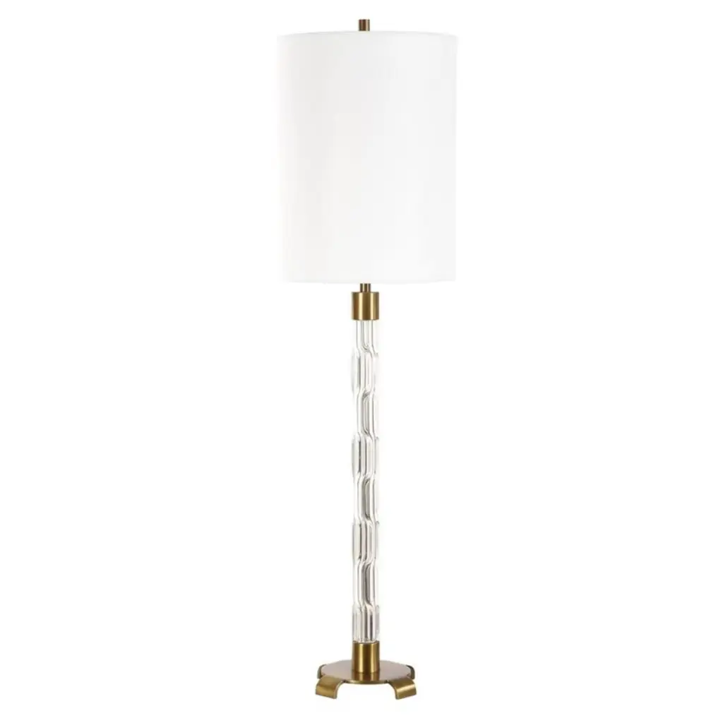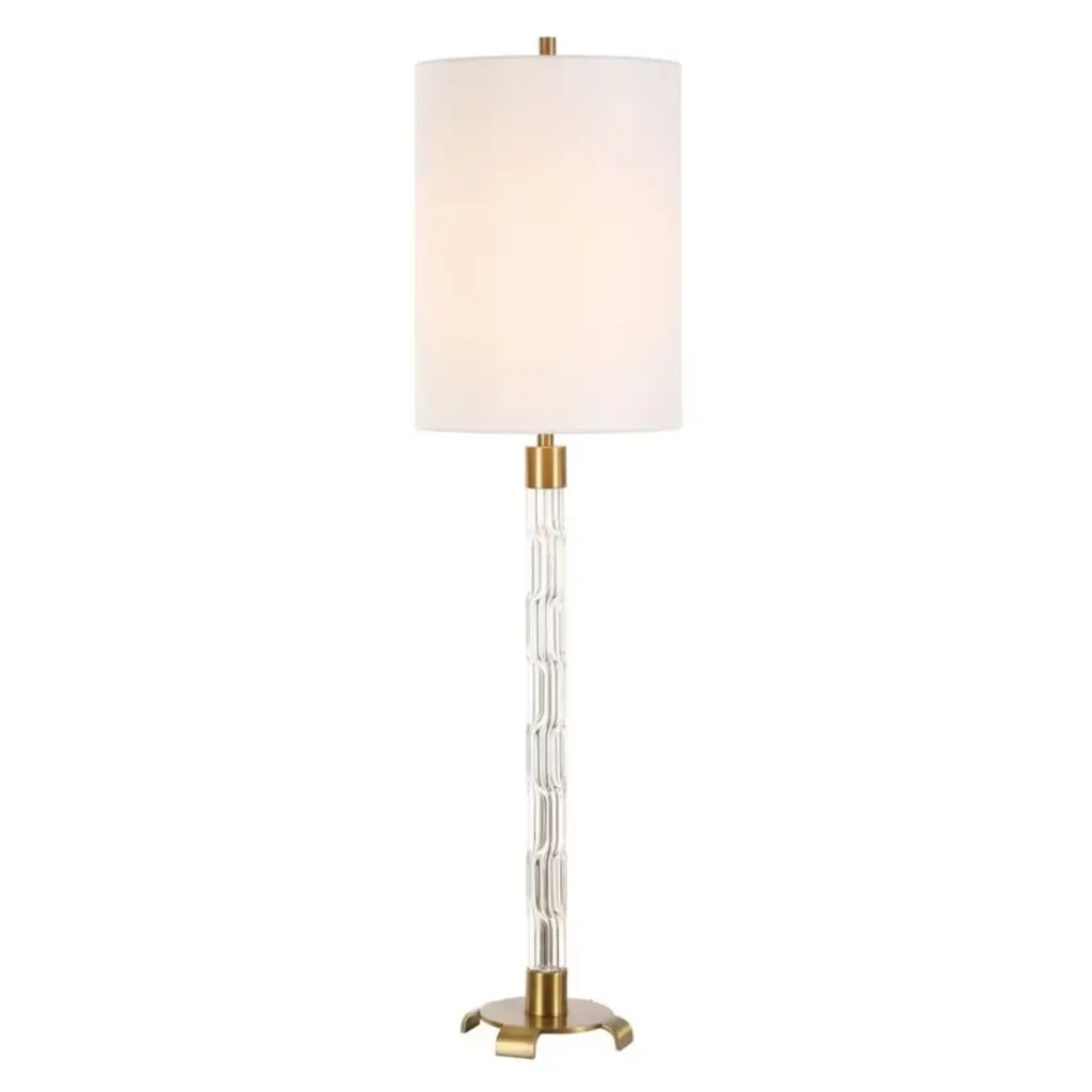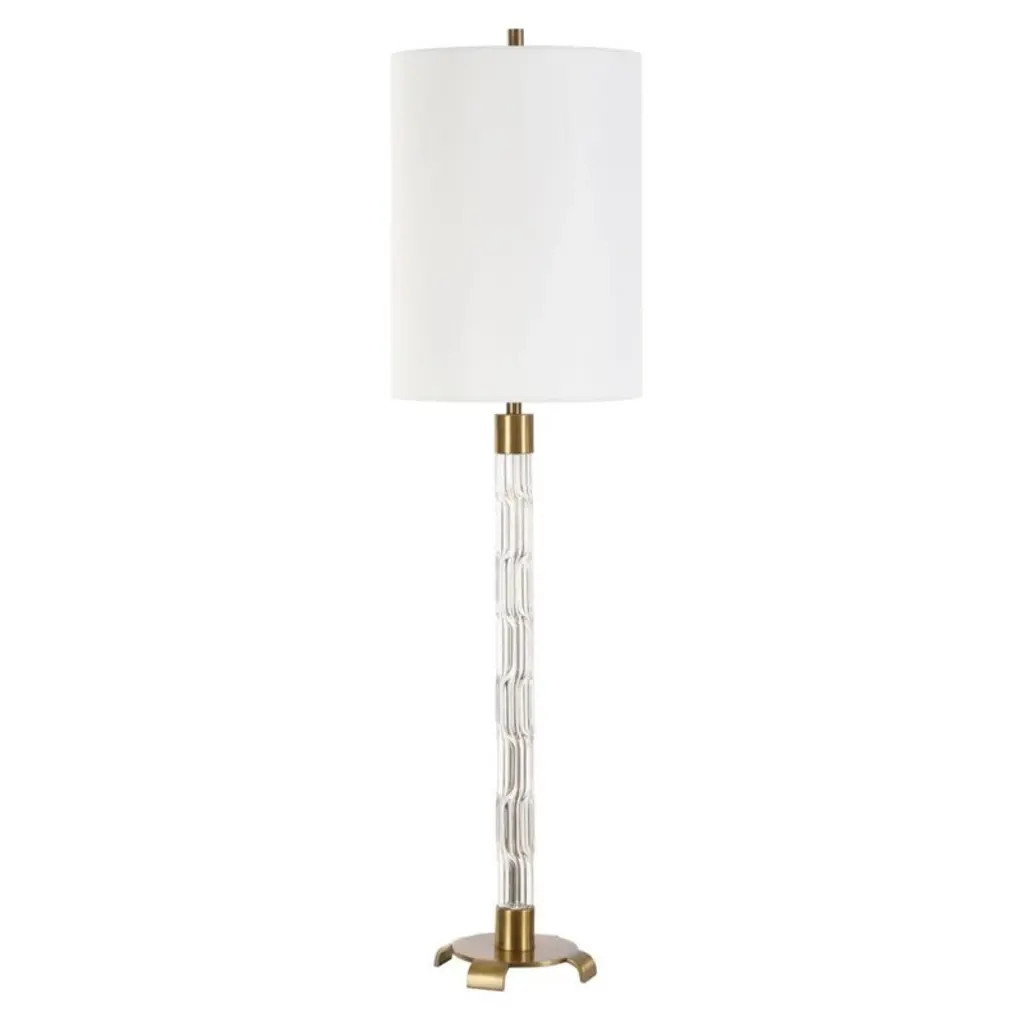 York Buffet Lamp-Petite Crystal with Embossed Pattern and Brass Accents Infused with mid-century charm, the York Buffet Lamp brings a refined elegance to any space. Its slender crystal column features an embossed pattern that adds depth and texture, while antique brass plated accents enhance its vintage appeal. Topped with a tall, round hardback shade in crisp white linen, this lamp balances visual delicacy with timeless sophistication—ideal for buffets, consoles, or sideboards where subtle illumination and style matter most. Key Features: Embossed Crystal Base: Petite crystal column with intricate embossing for a vintage-inspired aesthetic. Brass Accents: Antique brass plated hardware adds classic warmth and contrast. Refined Linen Shade: Tall round hardback shade in crisp white linen complements the slender profile. Functional Lighting: Equipped with a 3-way socket for customizable brightness (up to 150W). Slim & Elegant Profile: Ideal for narrow surfaces like console tables or dining buffets. Dimensions: 36.75" H x 10" W x 10" D This lamp offers the perfect blend of graceful design and practical lighting in a beautifully compact form.