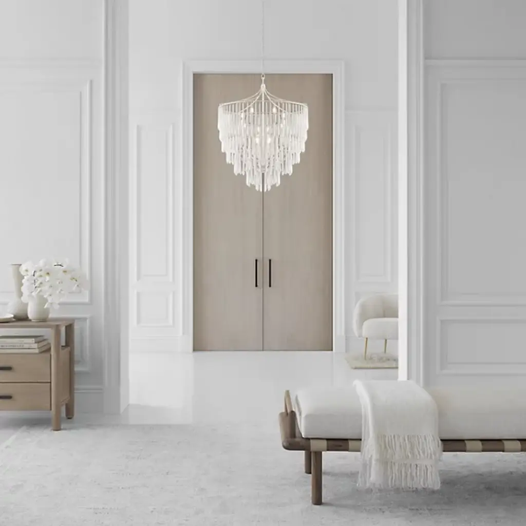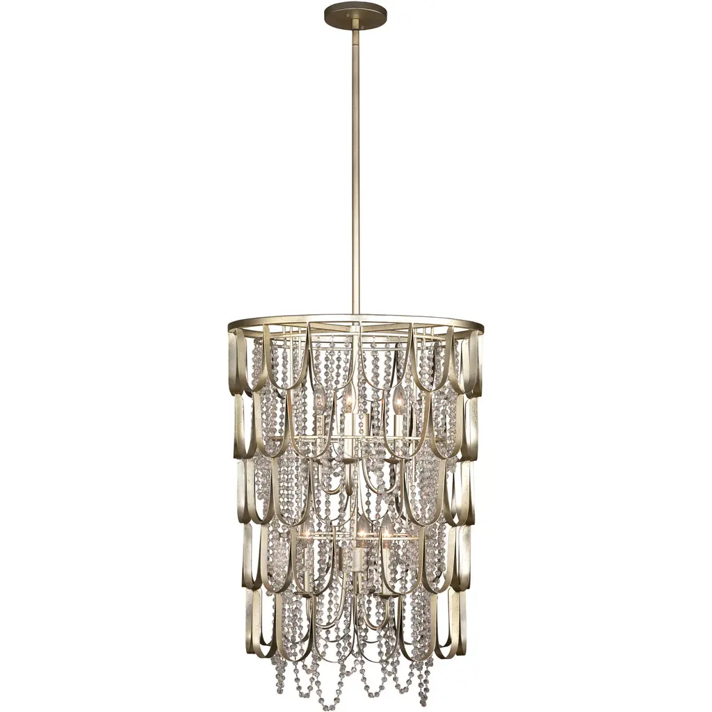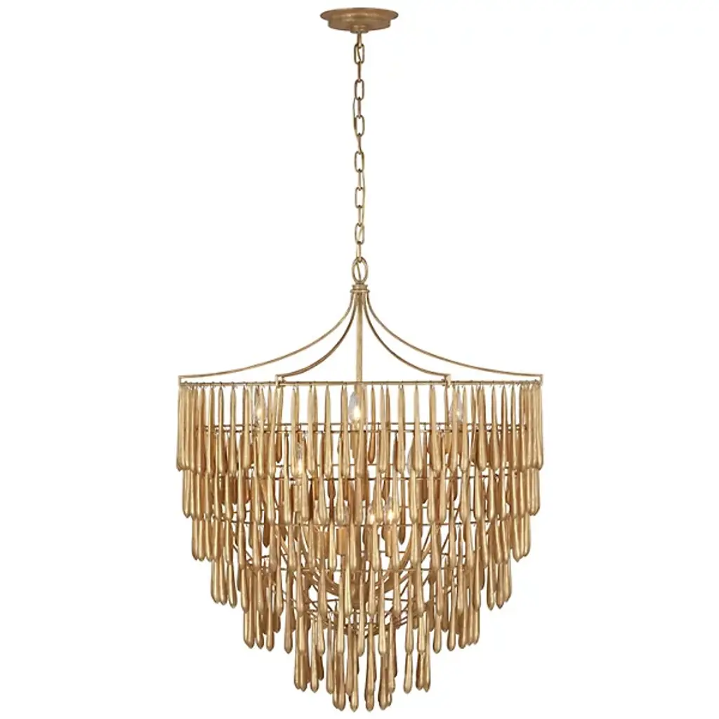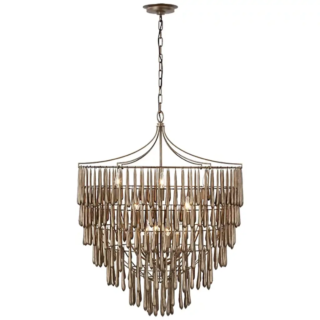 A broad-reaching, sculptural presence full of fine style elements. The Vacarro Chandelier from Visual Comfort Signature, formerly known as Visual Comfort, descends from a stepped circular ceiling mount along a medium-weight chain, terminating in a small oval finial that secures a slender stem that extends down to candelabra-style lamping that blazes out in all directions. This bright light is gentled by a complex, multi-tiered shade structure of individual metal teardrops affixed to a bowl-shaped wireframe below the lamping, creating an organic presence that dispenses a reflected gleam around the fixture.