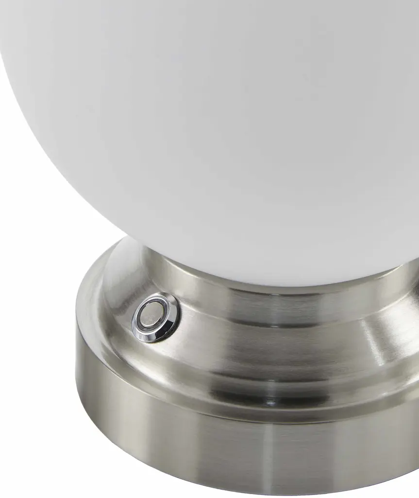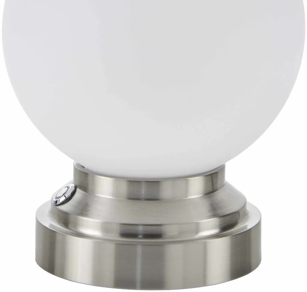 Collection: Vacquiers Colors: Metallic - Nickel, White, Black Material: Body: Iron,Base: Iron,Shade (Outside): Glass,Shade (Inside): Glass Styles: Southwestern Made In: China Lighting Type: Accent Table Lighting Base: Iron Base Color: Metallic - Nickel Shade Material: GlassGlass Shade Color: WhiteWhite Cord Length: 6' Switch Type: On/Off Number of Bulbs: 1 Socket Type: LED Bulb Wattage: 7W